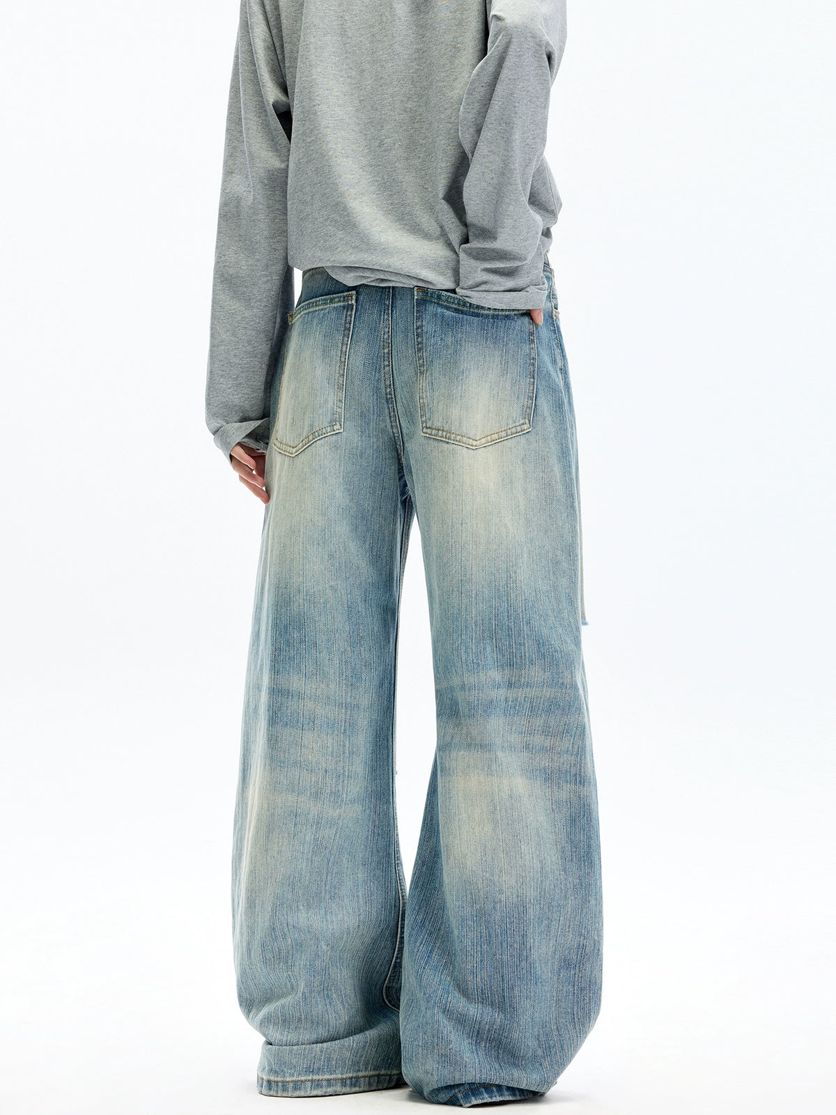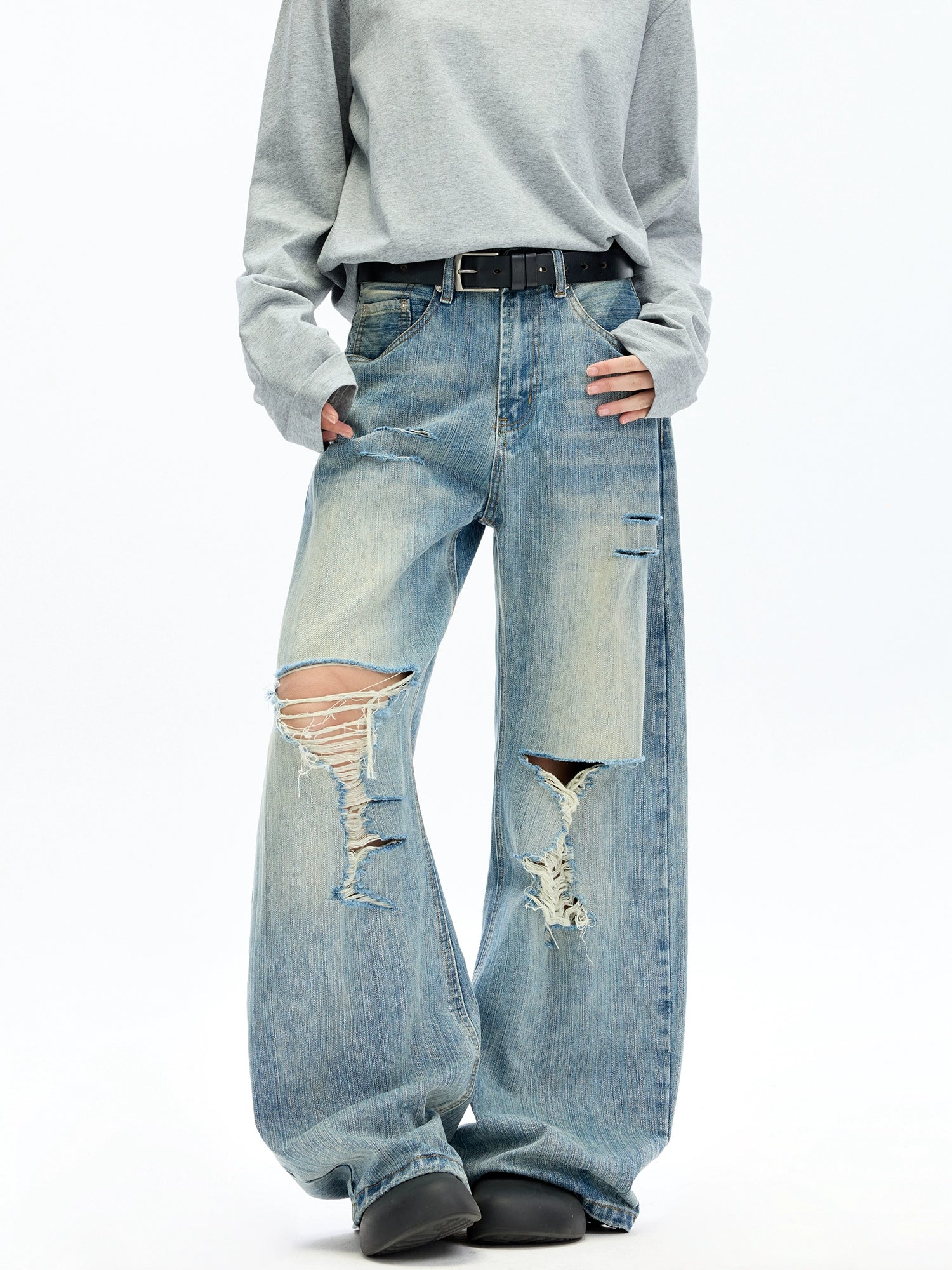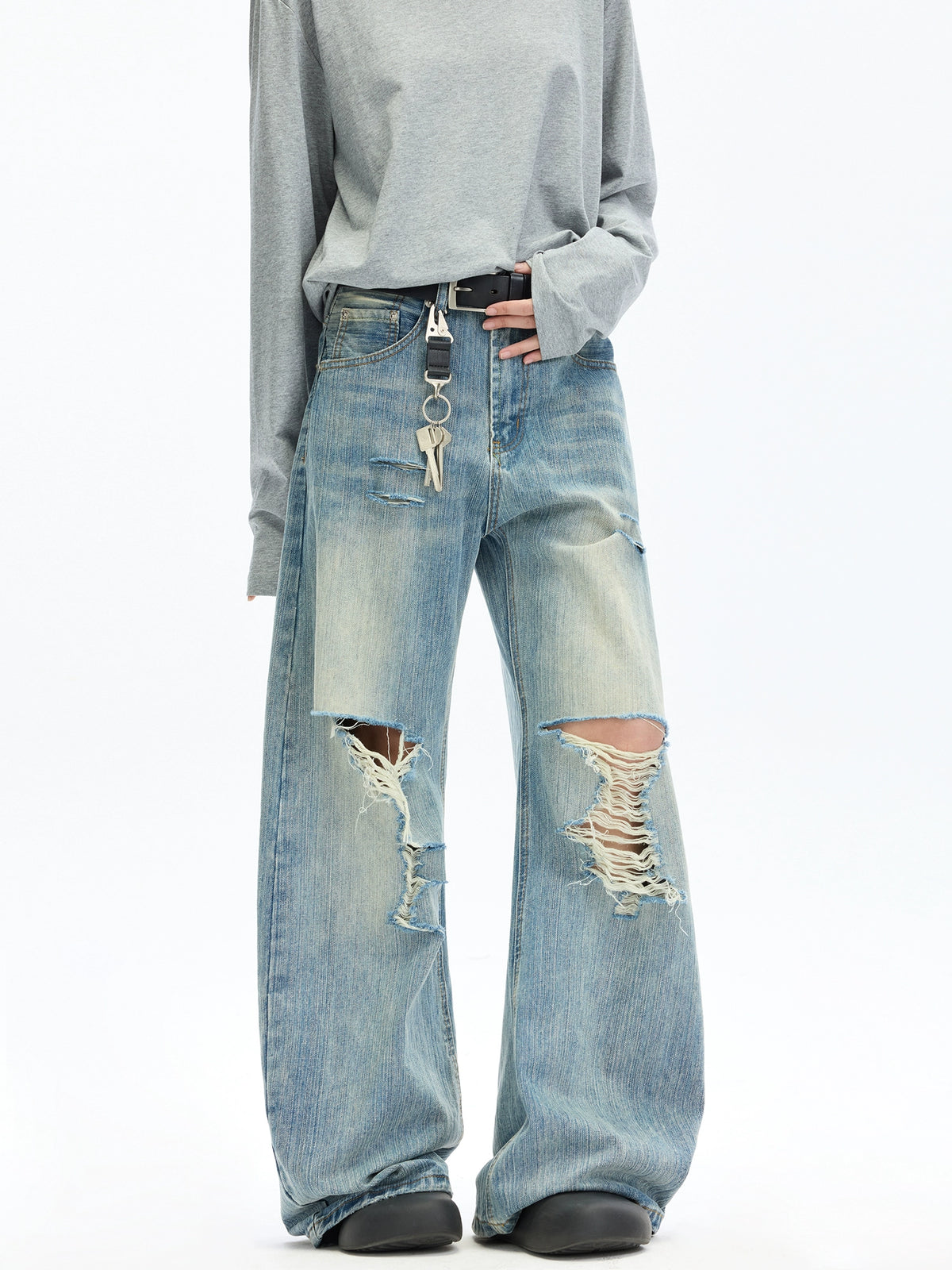 破れたダメージ加工のワイドレッグジーンズパンツ