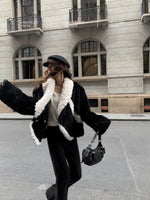 A plush, short faux-fur jacket with a contrasting “panda” color palette that’s both chic and irresistibly cozy. The soft-touch faux shearling feels thick yet lightweight, keeping you warm without adding bulk. Its V-shaped lapel neckline flatters the face and elongates the neck, while the cropped length subtly enhances your silhouette for a taller, slimmer look.