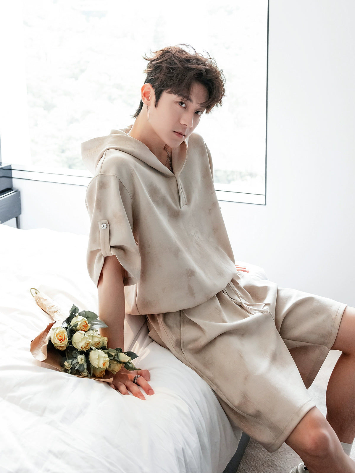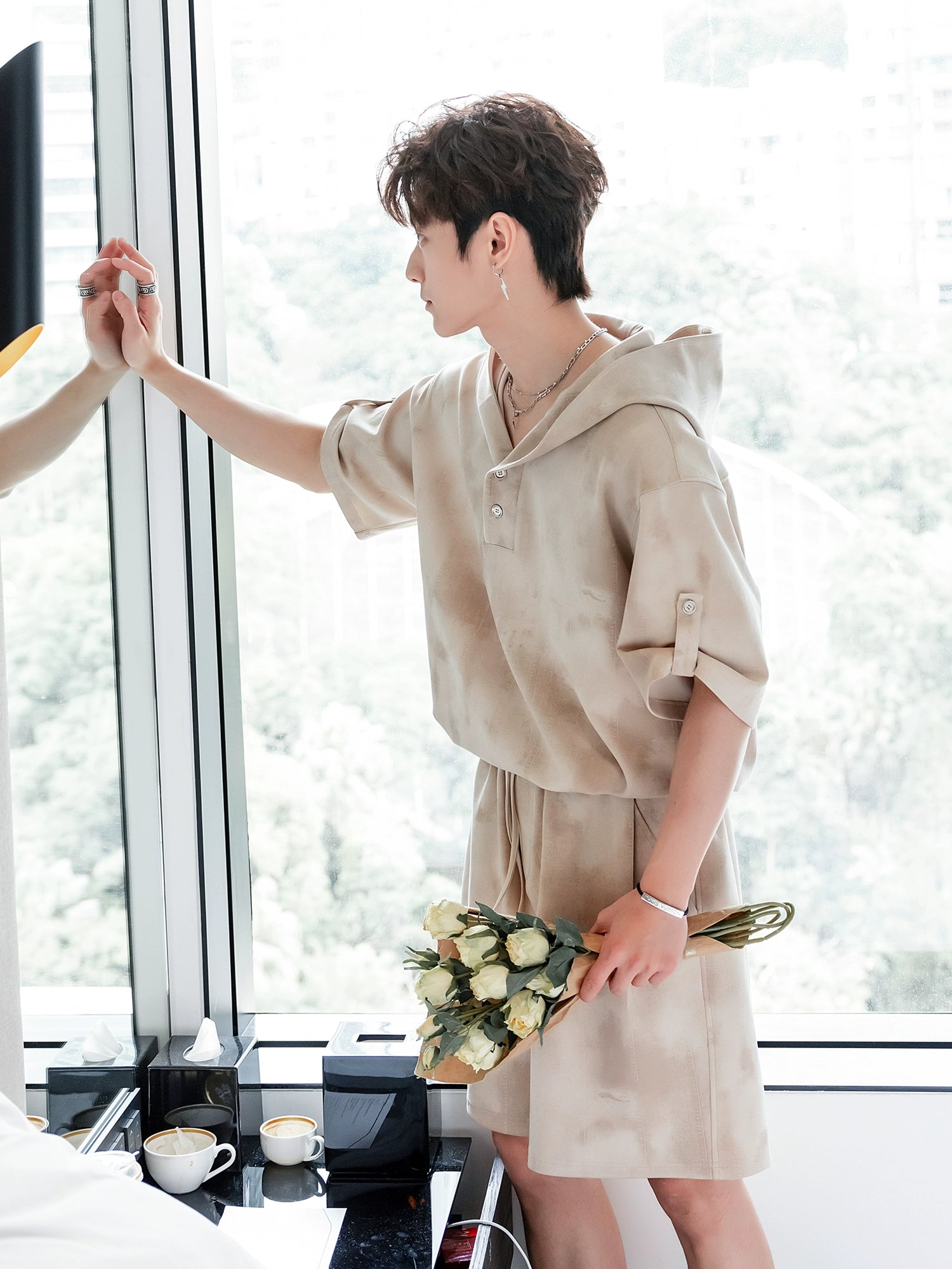 - 統合されたフード付きカラーとリブウエストバンドショーツデザイン, シンプルなプリントデザインの組み合わせ, 合金ボタンのアクセント, 現代的で, カジュアル, そしてアーバンスポーツスタイルを表現.