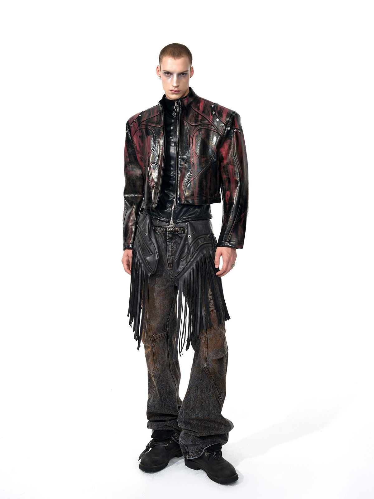 スタンドカラーのスタッズ付きレザーバイカージャケット