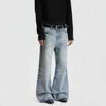 ダメージ加工されたヒゲ付きワイドレッグデニムパンツ