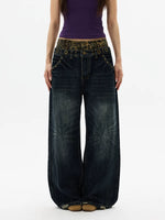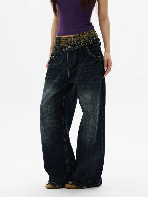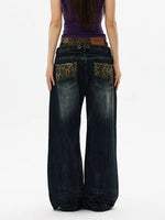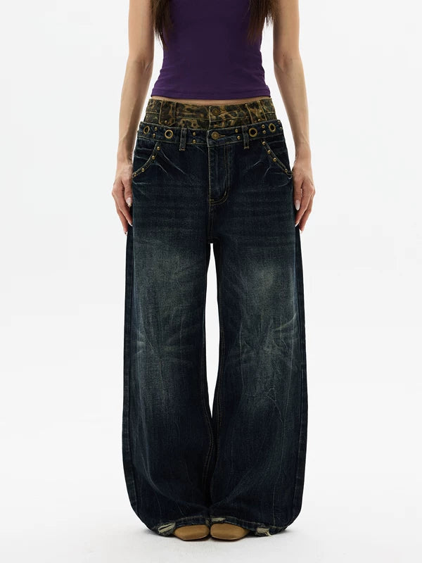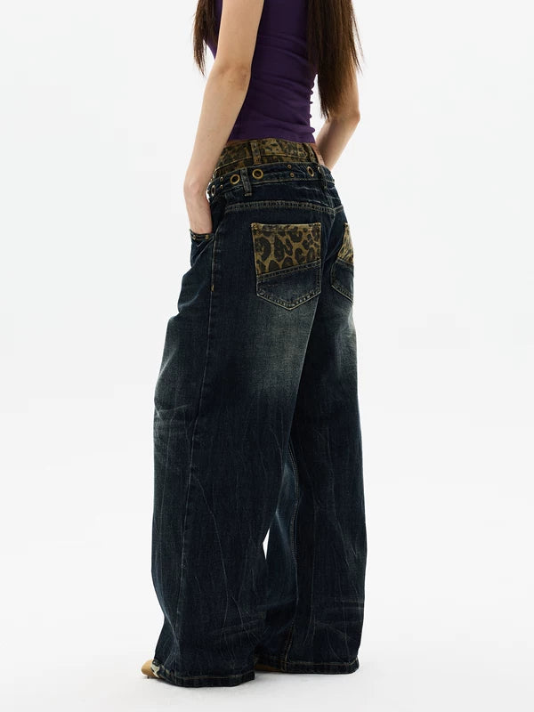 레오파드 패치 더블 웨이스트 와이드 레그 진