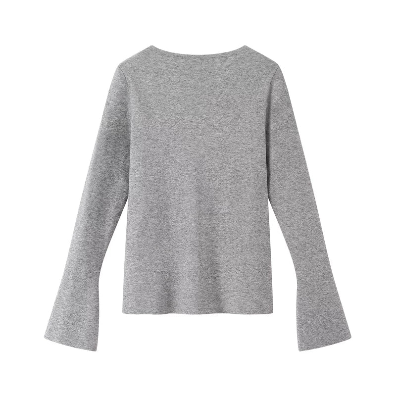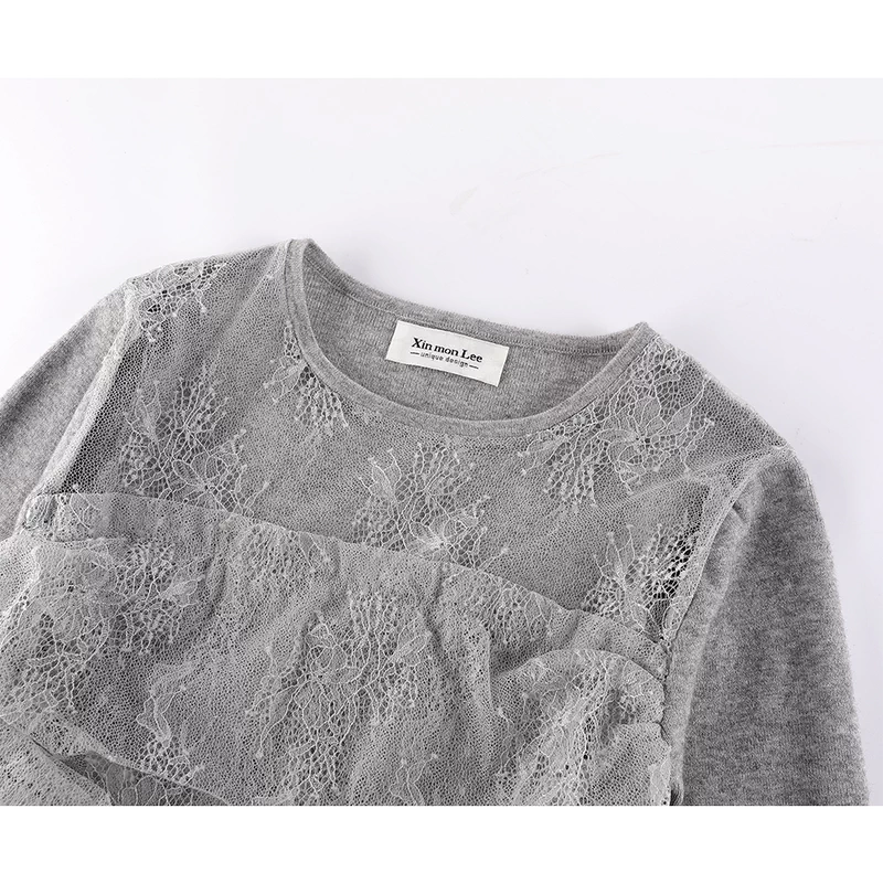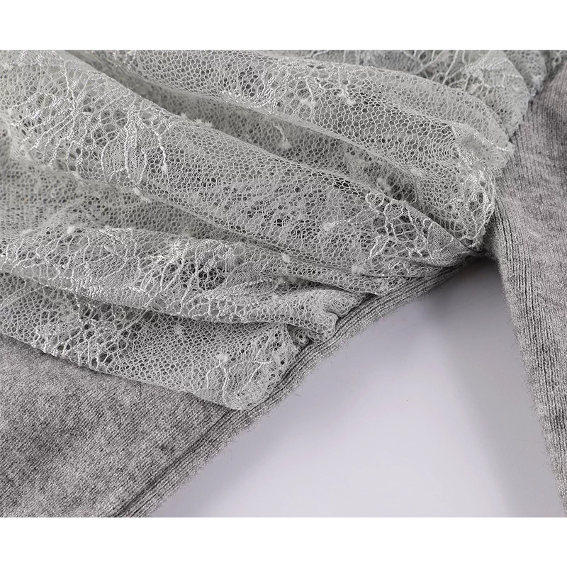 벨 슬리브가 있는 레이스 오버레이 니트 풀오버