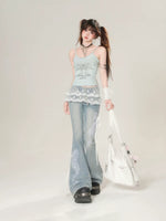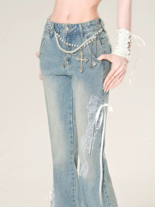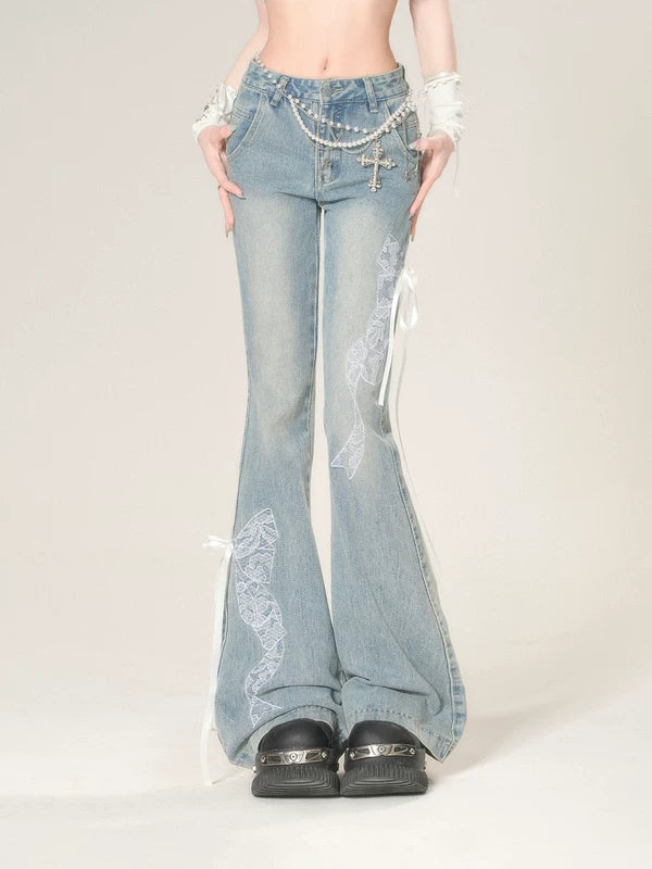 레이스 디테일 플레어 슬림핏 진 팬츠