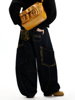 레오파드 패치워크 와이드 레그 카고 청바지 팬츠