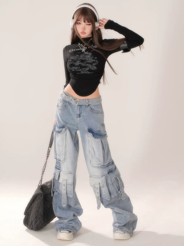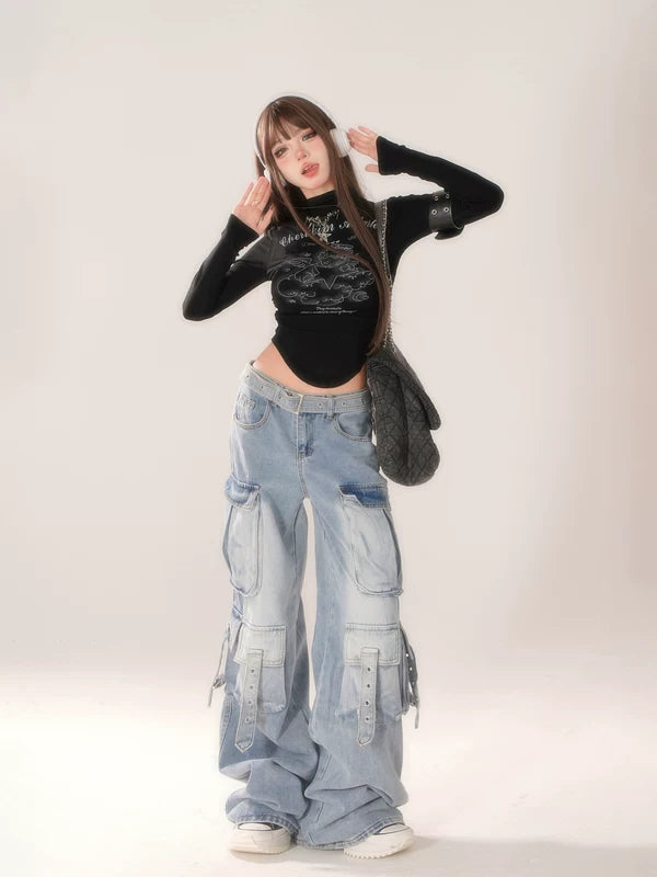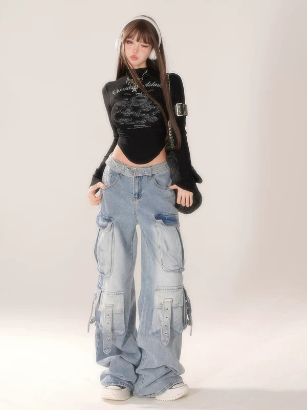 와이드 레그 멀티 포켓 카고 진 바지