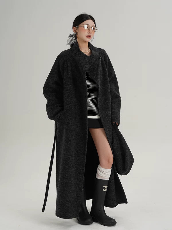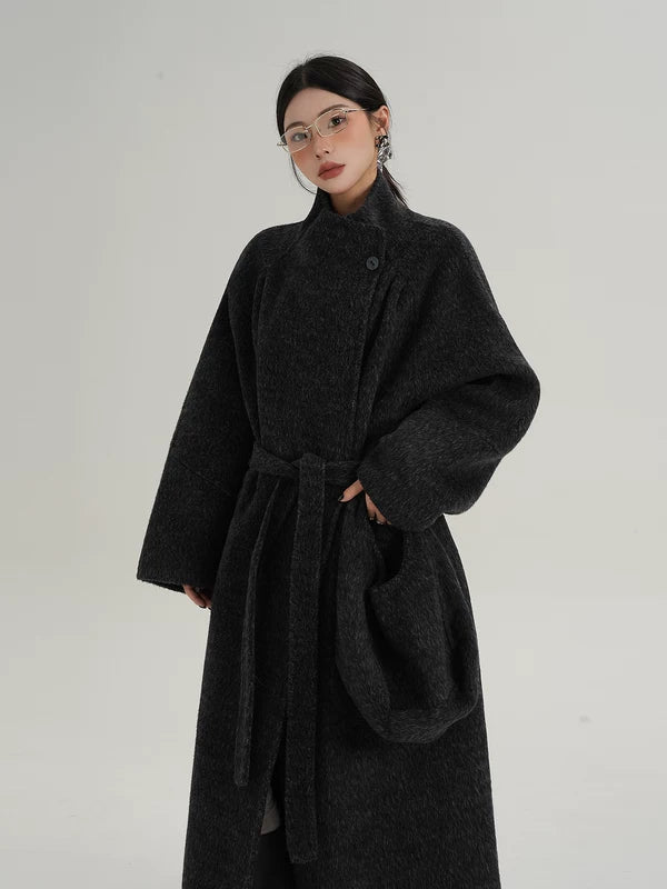 스탠드 칼라 벨트가 있는 긴 울 코트