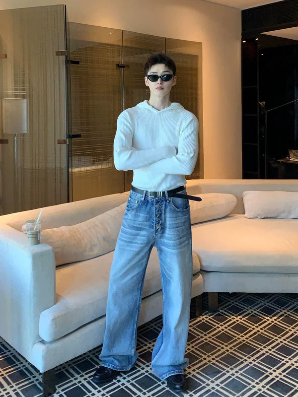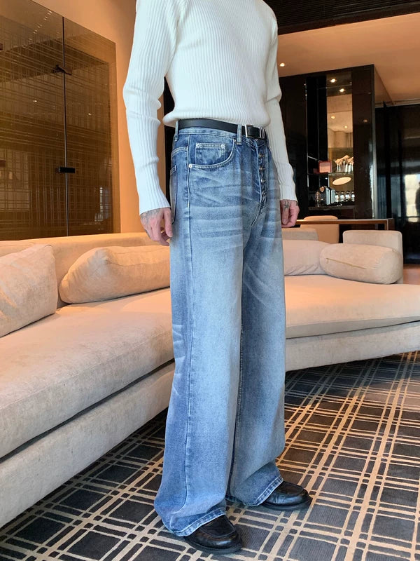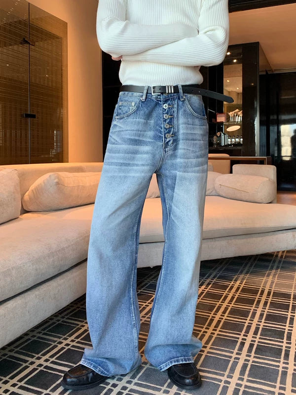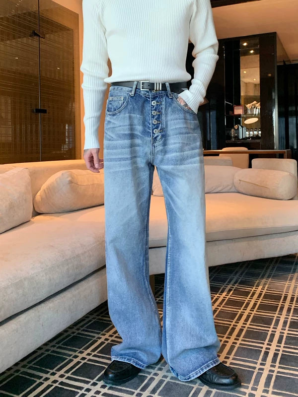 와이드 레그 버튼 플라이 위스커 청바지 팬츠