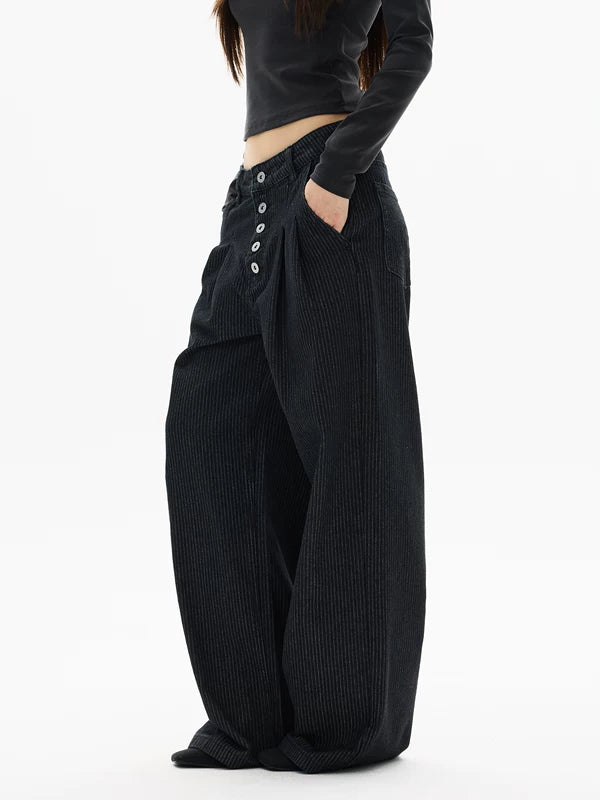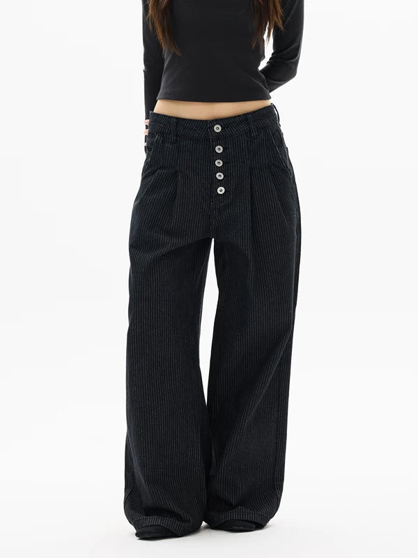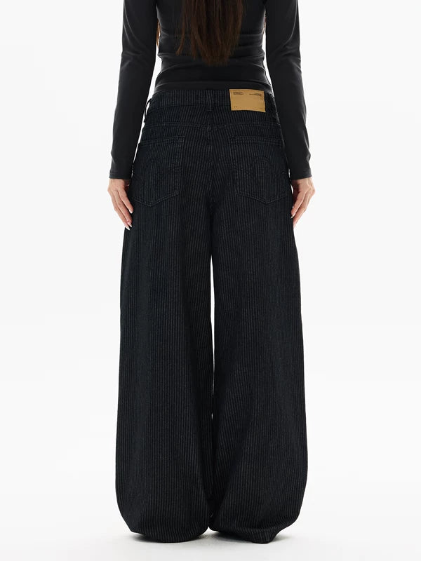 레트로 핀스트라이프 주름 와이드 레그 팬츠