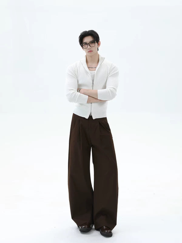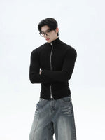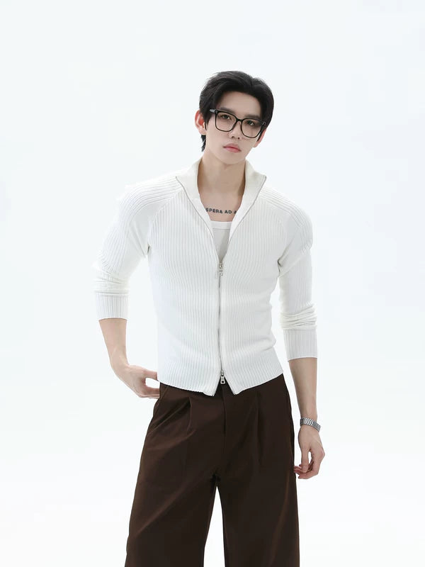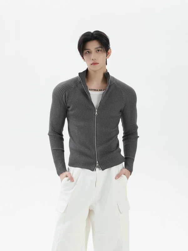 골지 스탠드 카라 슬림 핏 지퍼 가디건