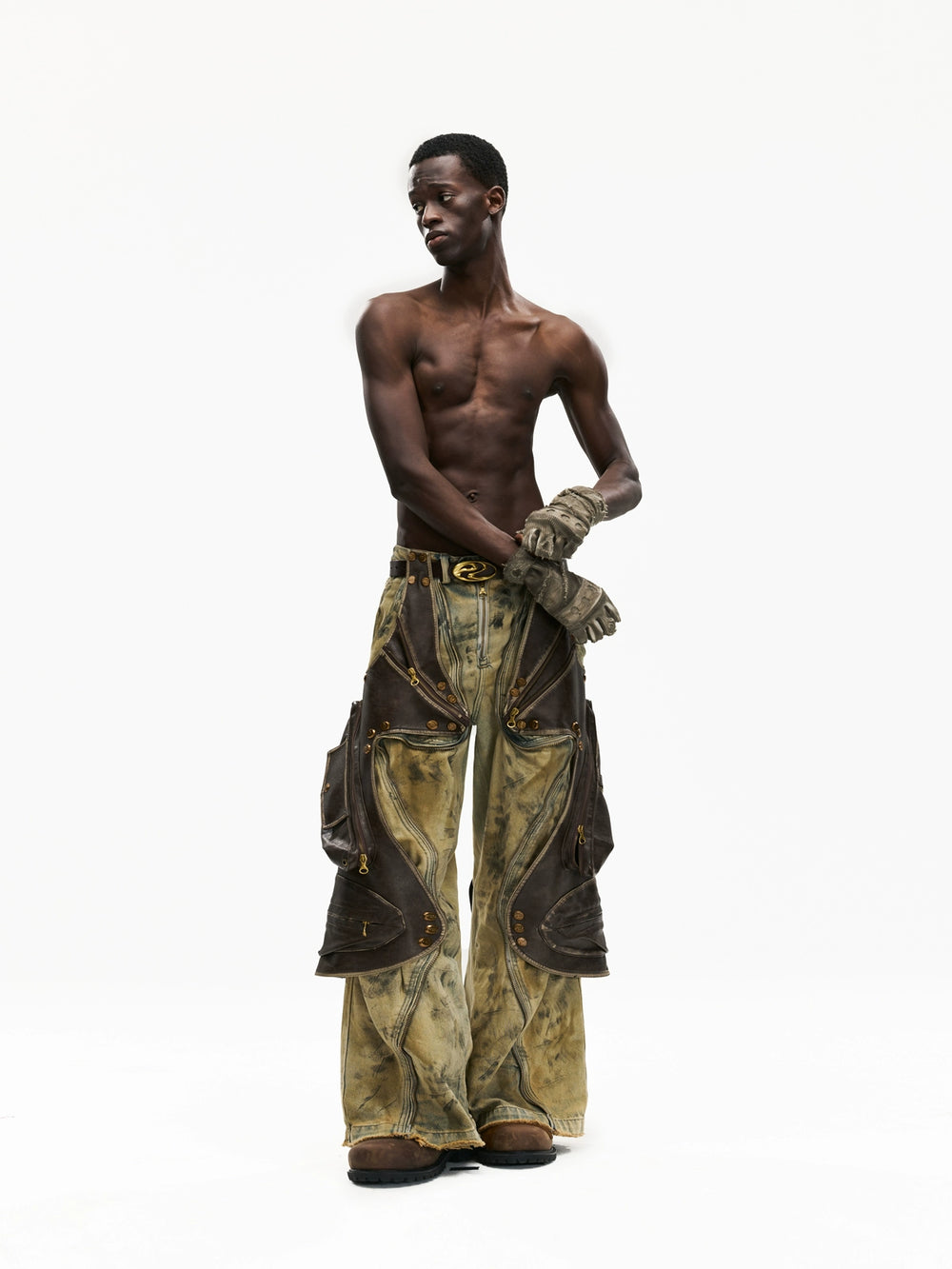 - 바지의 실용성을 높이고 서부 카우보이 스타일의 요소를 강조하는 분리 가능한 가죽 주머니를 사용하여 약간 플레어진 실루엣으로 디자인되었습니다,