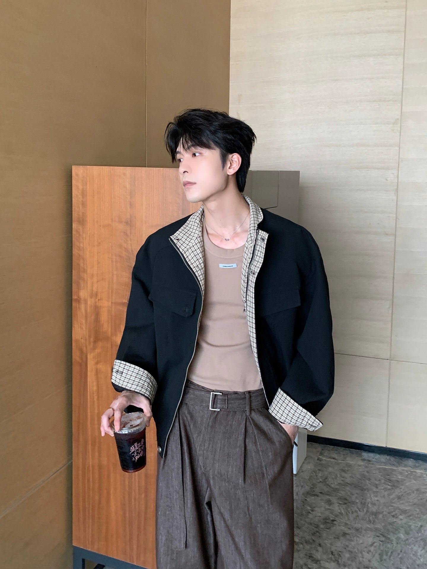 플래드 안감이 있는 해링턴 투피스 재킷