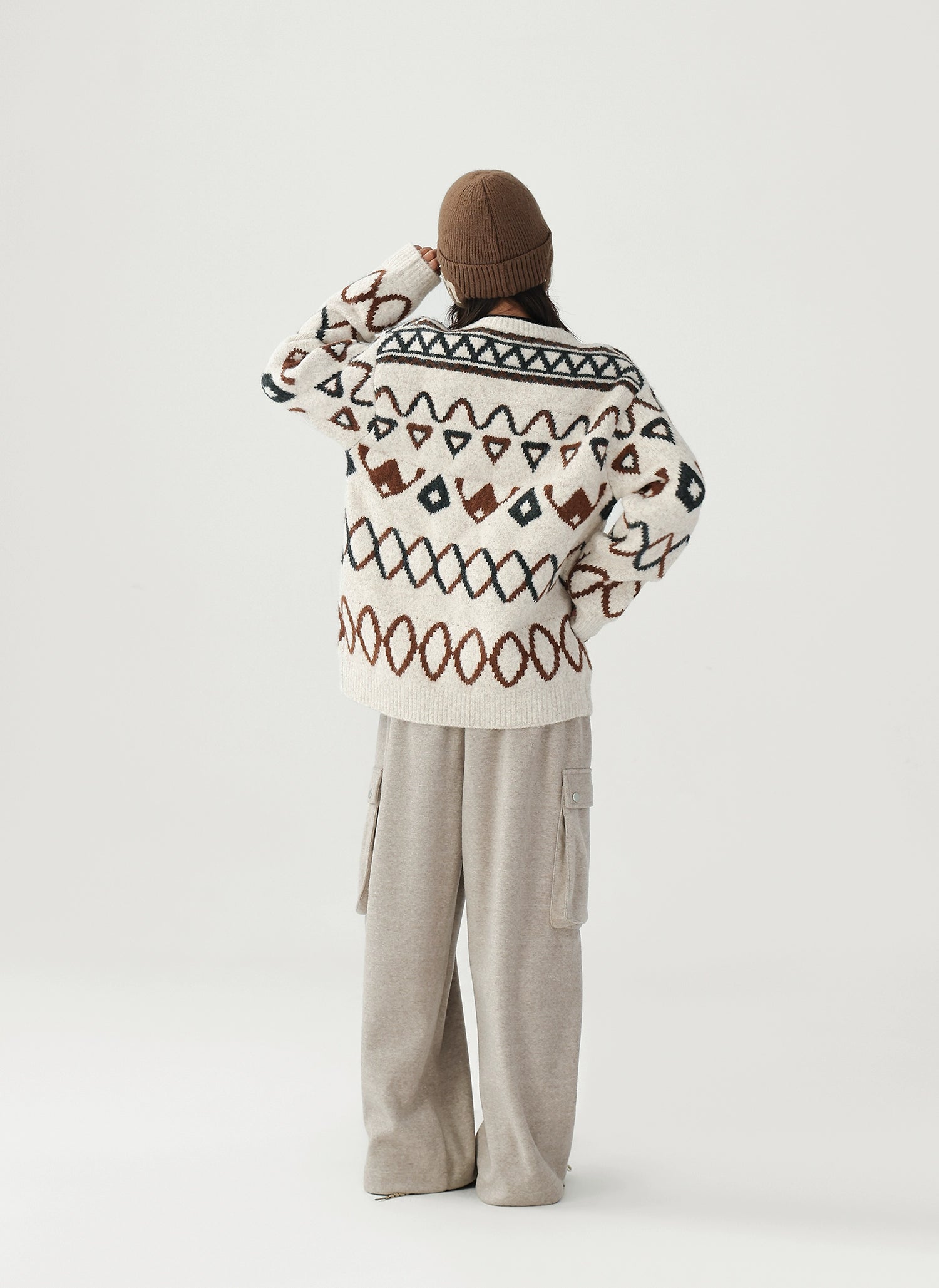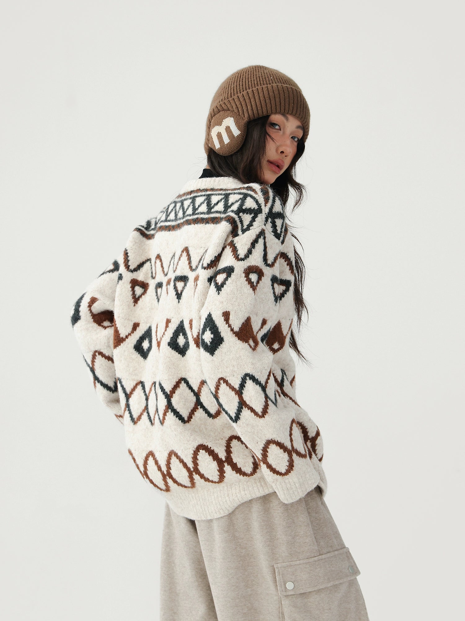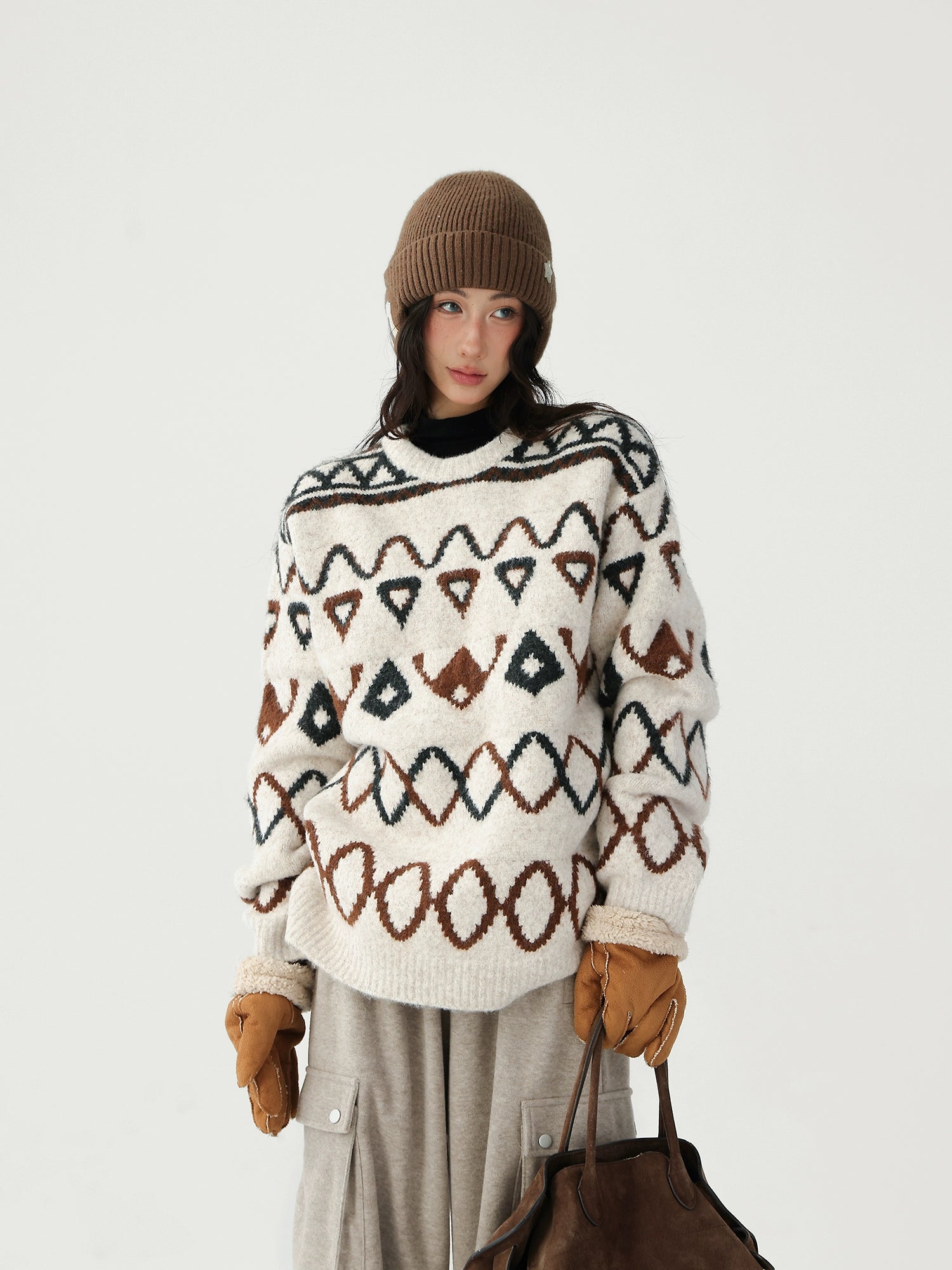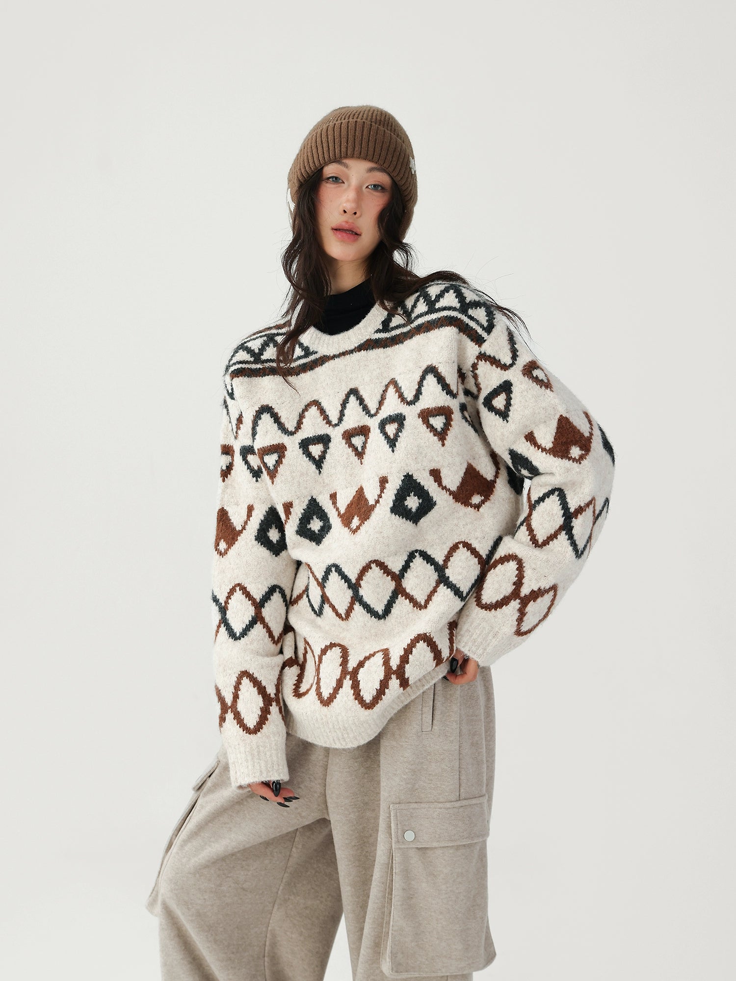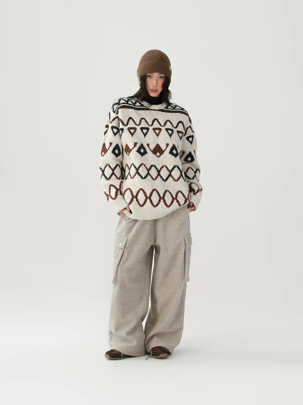Jacquard diamantpatroon losse gebreide trui