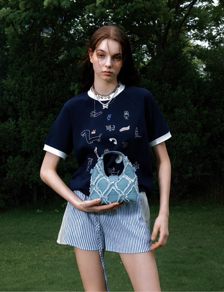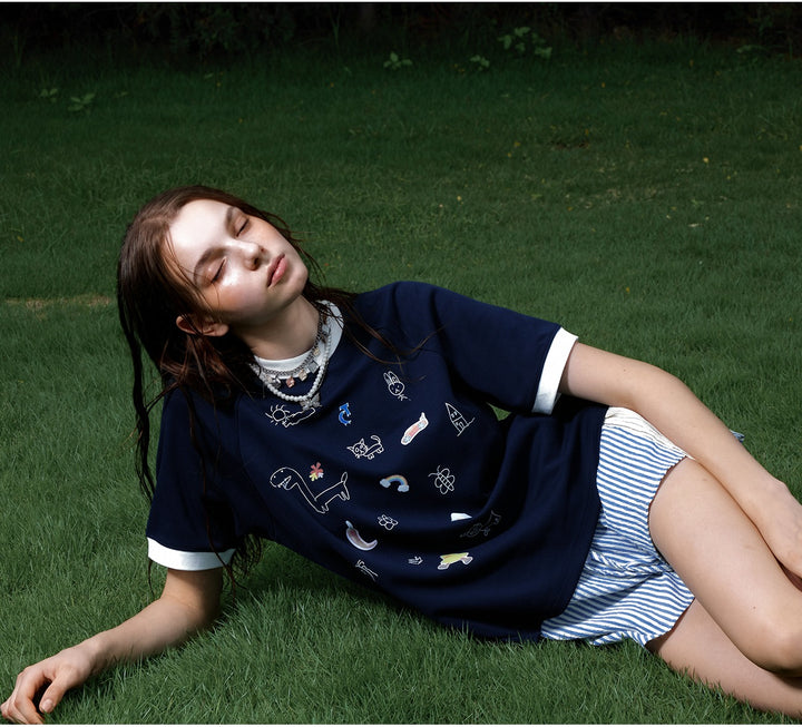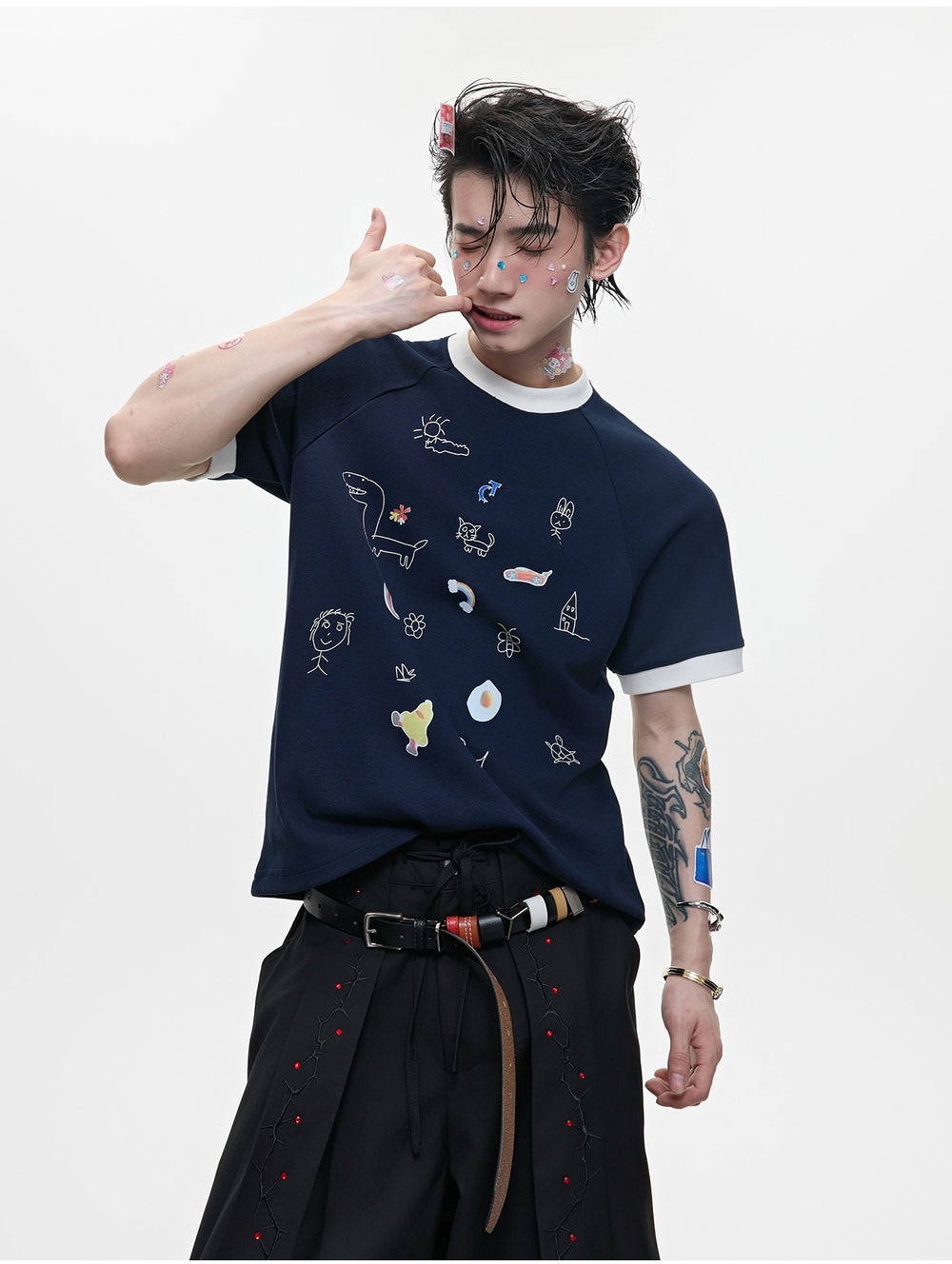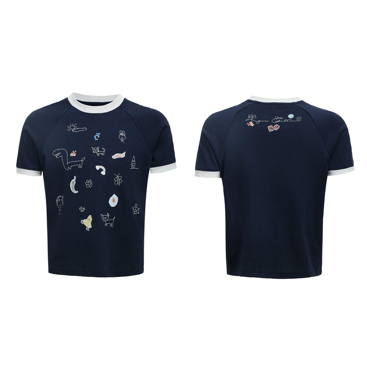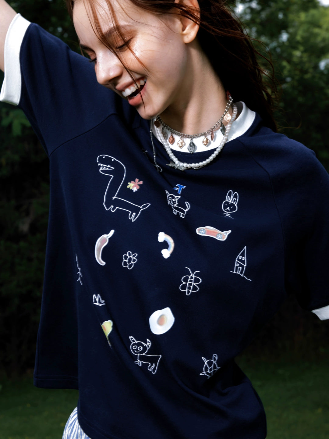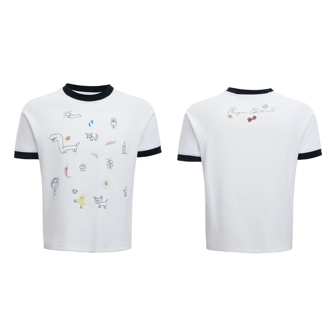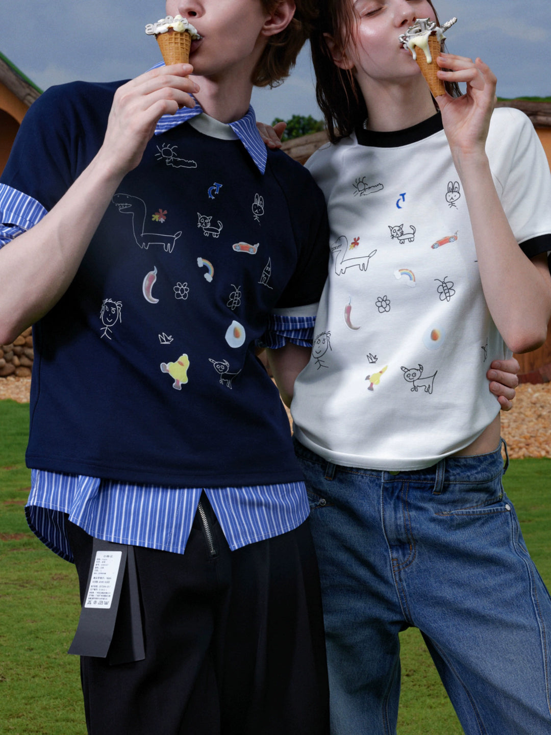 - T-skjorten er designet med konseptet om å kombinere enkelhet og barnslig moro. Den overordnede silhuetten er enkel og elegant, med en klassisk rund hals og kortermet design som er allsidig og praktisk, egnet for bruk i ulike anledninger. På bakgrunn av enkelhet, inkorporerer den et stort antall tegneseriemønstre fulle av barnslig moro. Disse mønstrene skisserer ulike søte bilder med enkle linjer, som dinosaurer, små dyr og små gjenstander, som om de presenterer de vakre fantasiene og kreativiteten fra barndommen på klærne. Enten den brukes av voksne eller barn, kan den vekke uskylden og gleden dypt i hjertet, og vise en avslappet, livlig og kreativ klesstil.