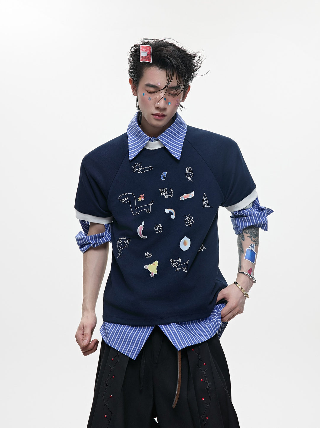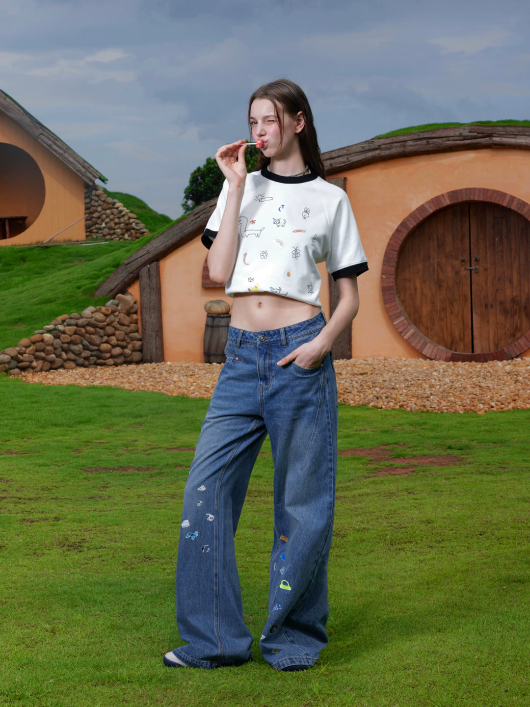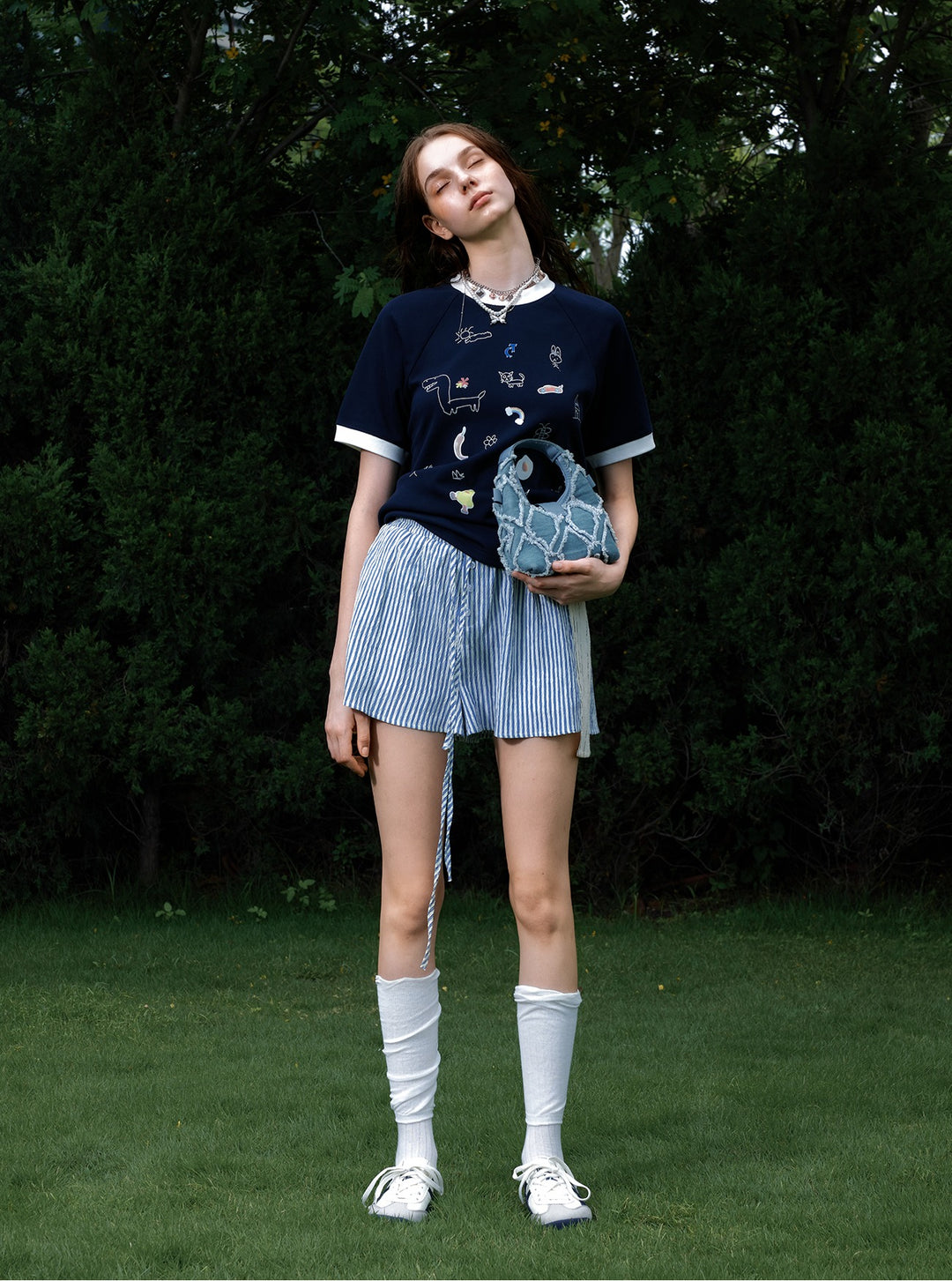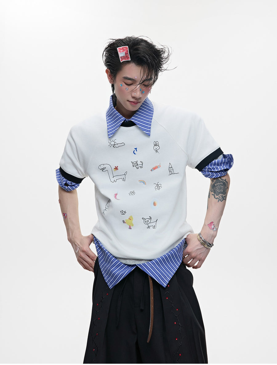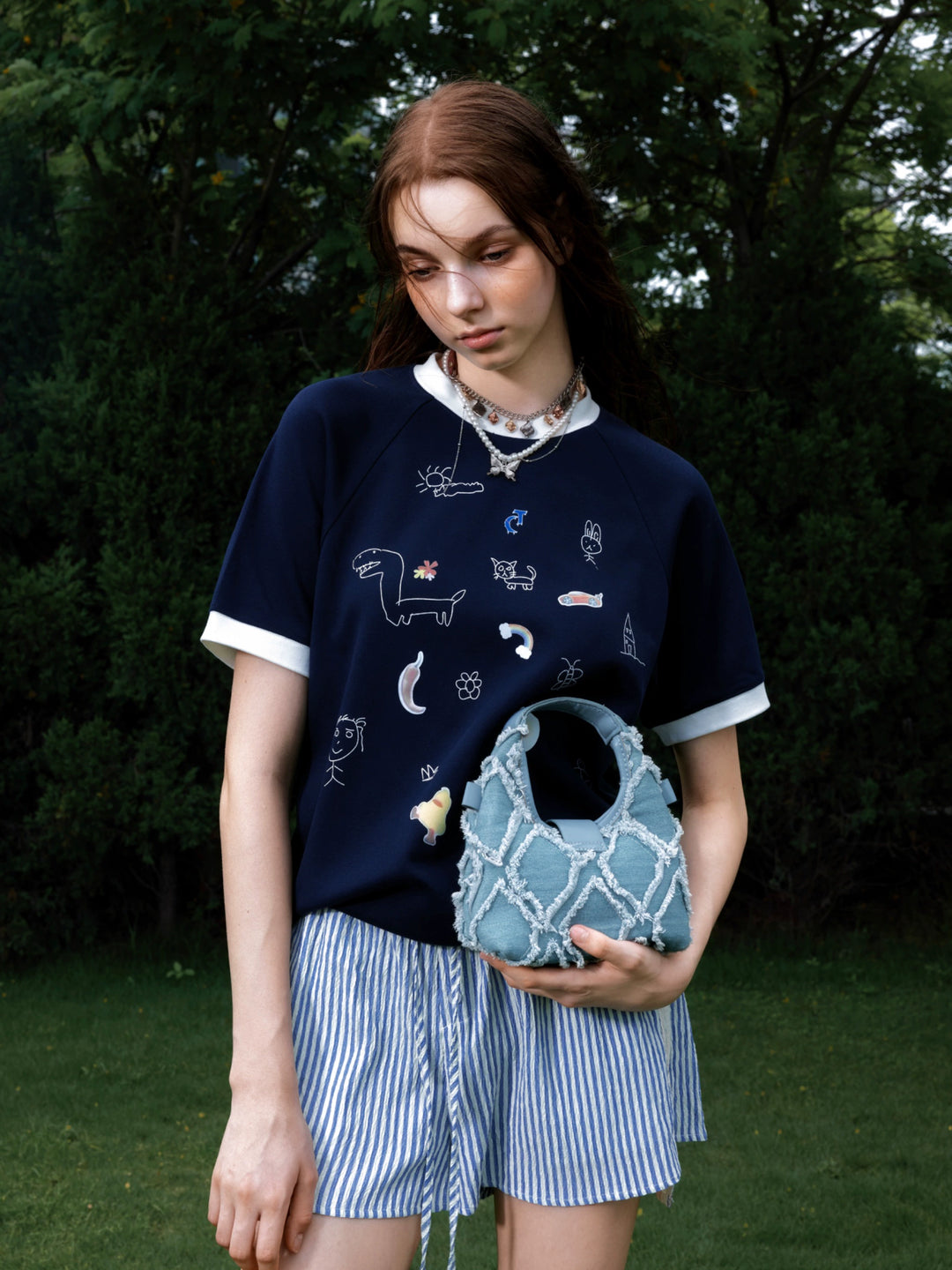 - T-skjorten er designet med konseptet om å kombinere enkelhet og barnslig moro. Den overordnede silhuetten er enkel og elegant, med en klassisk rund hals og kortermet design som er allsidig og praktisk, egnet for bruk i ulike anledninger. På bakgrunn av enkelhet, inkorporerer den et stort antall tegneseriemønstre fulle av barnslig moro. Disse mønstrene skisserer ulike søte bilder med enkle linjer, som dinosaurer, små dyr og små gjenstander, som om de presenterer de vakre fantasiene og kreativiteten fra barndommen på klærne. Enten den brukes av voksne eller barn, kan den vekke uskylden og gleden dypt i hjertet, og vise en avslappet, livlig og kreativ klesstil.