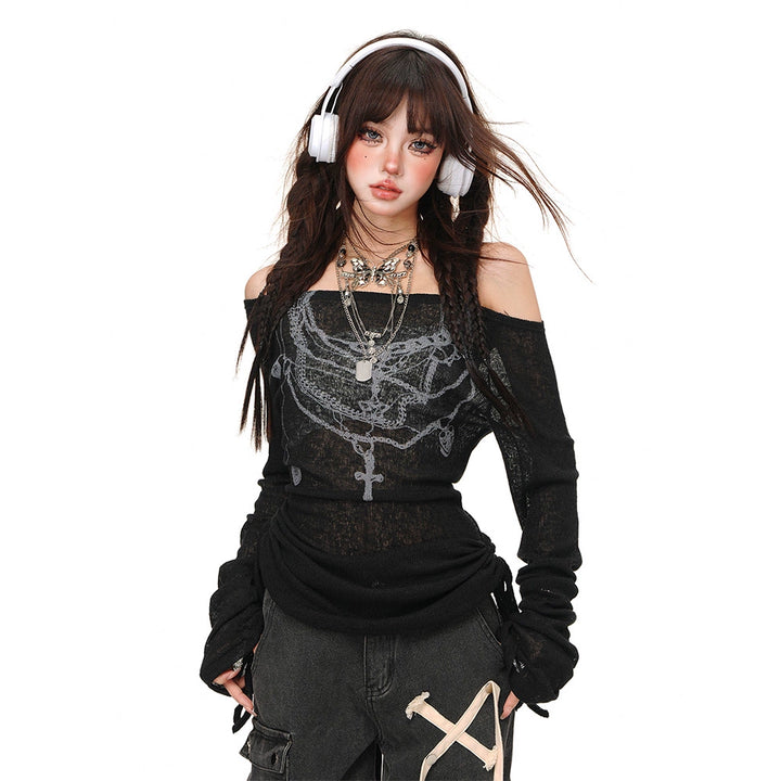 Off-Shoulder Gjennomsiktig Langermet Drawstring Topp