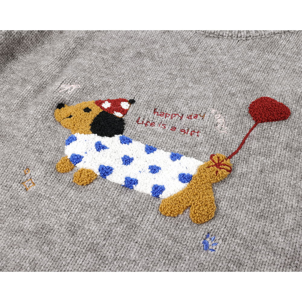 Suéter Pullover Tricotado com Bordado de Cachorro Salsicha