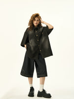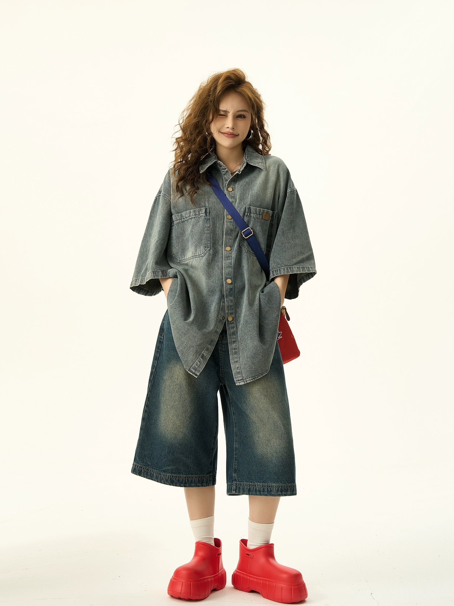Camisa de Denim Desgastada com Manga Curta Oversized