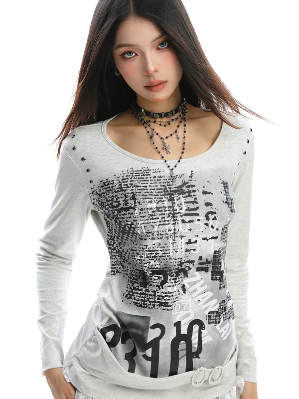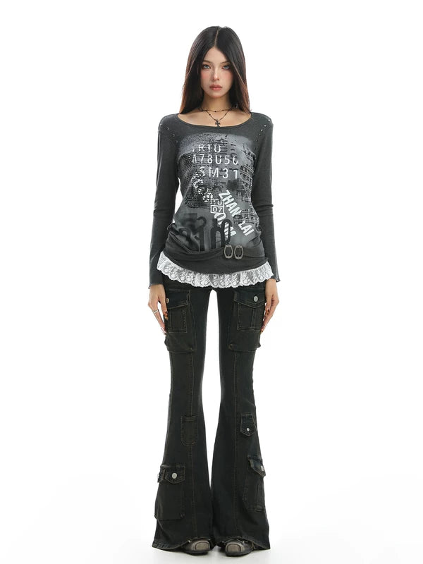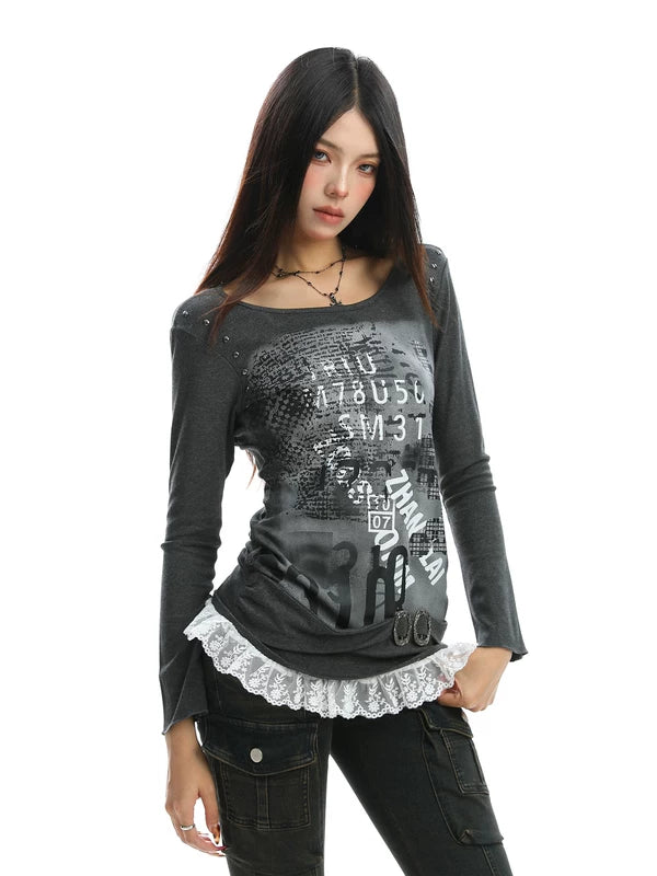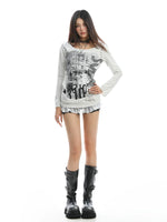 Camiseta de Manga Longa com Renda e Estampa Punk com Studs