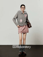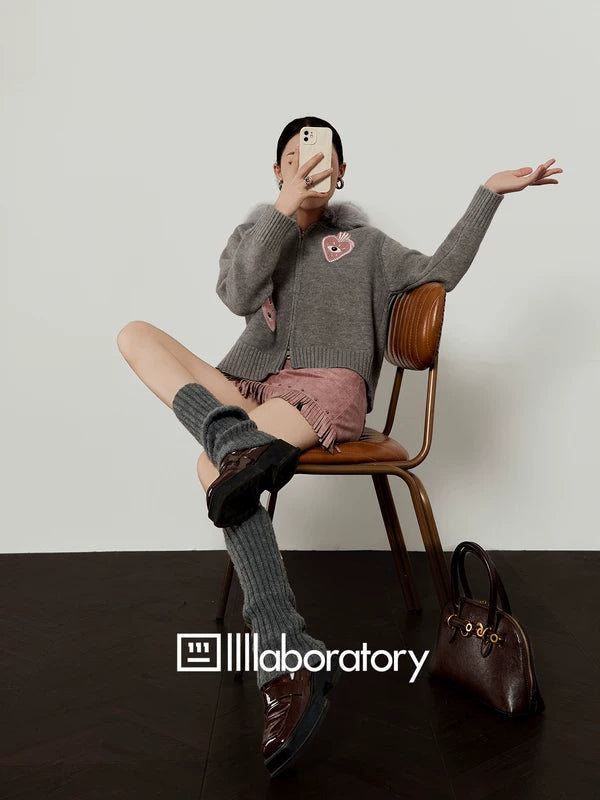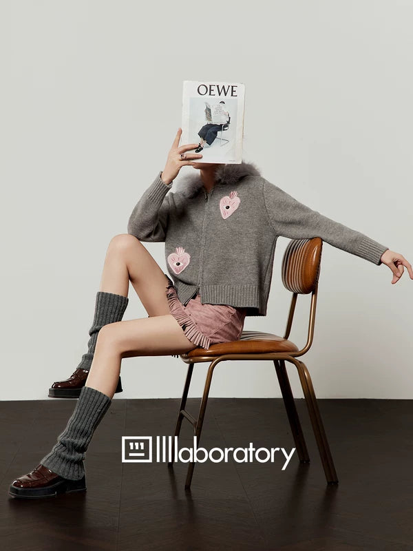 Cardigã de Tricô com Gola de Pelo Bordada com Coração