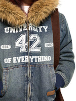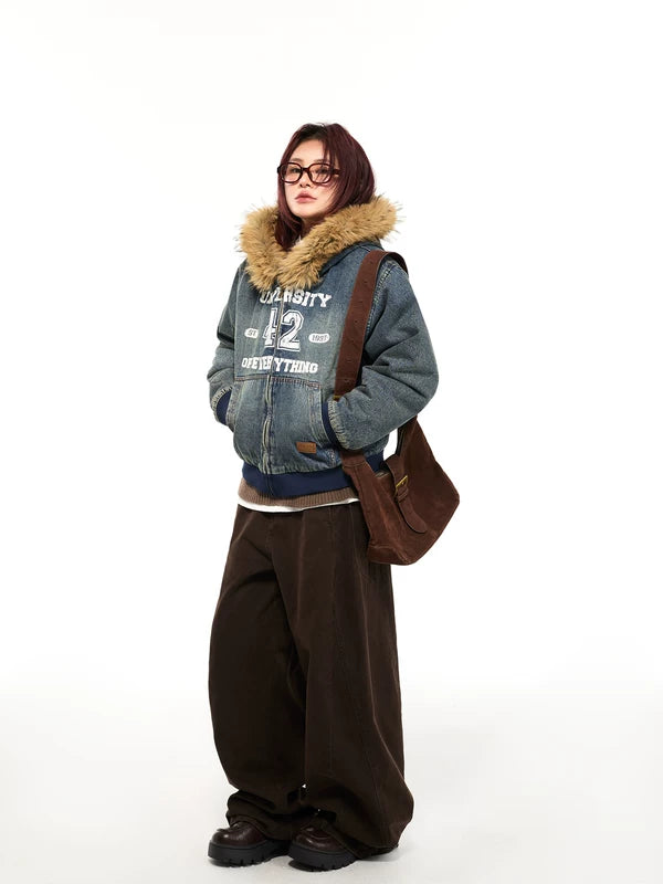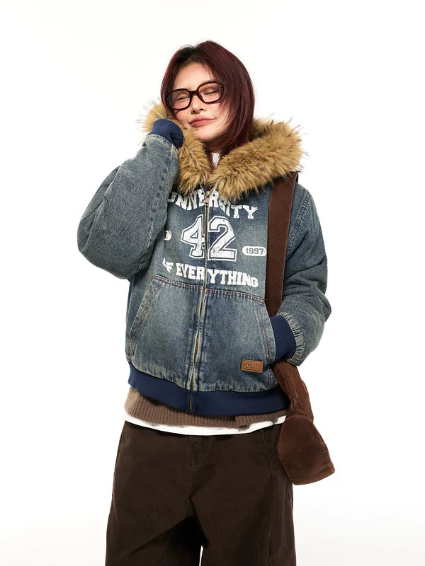 Jaqueta de Inverno de Denim com Capuz de Pelúcia Sintética