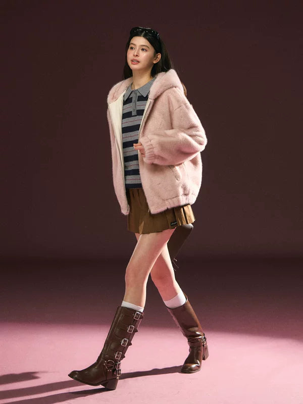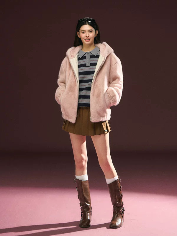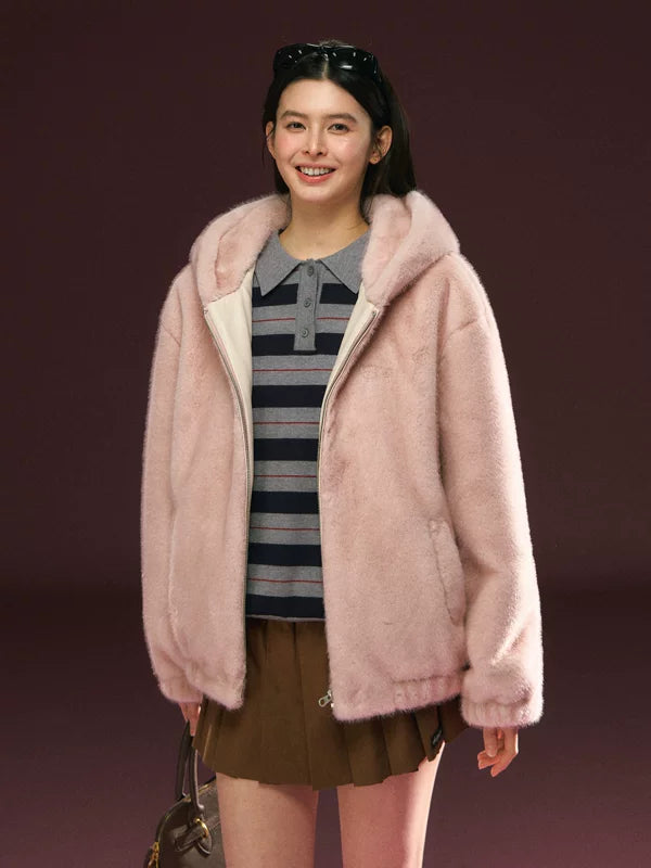 Jaqueta com Capuz de Zíper de Pelúcia Falsa
