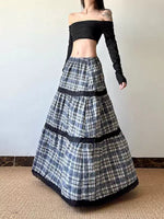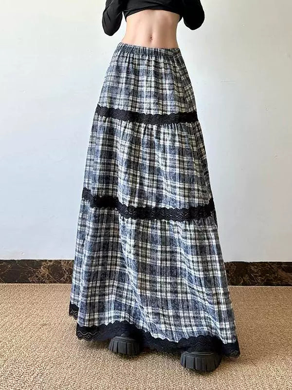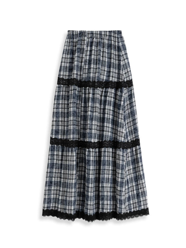 Saia com Cintura Elástica e Recortes em Renda Xadrez
