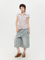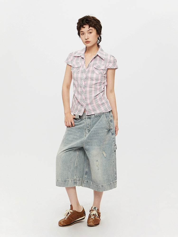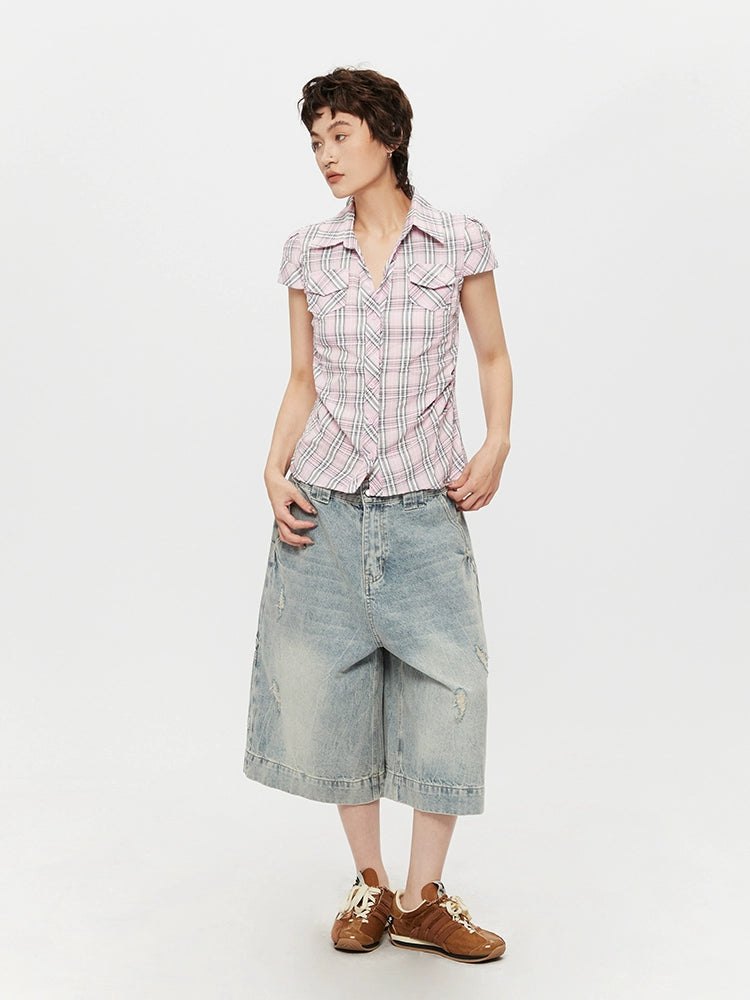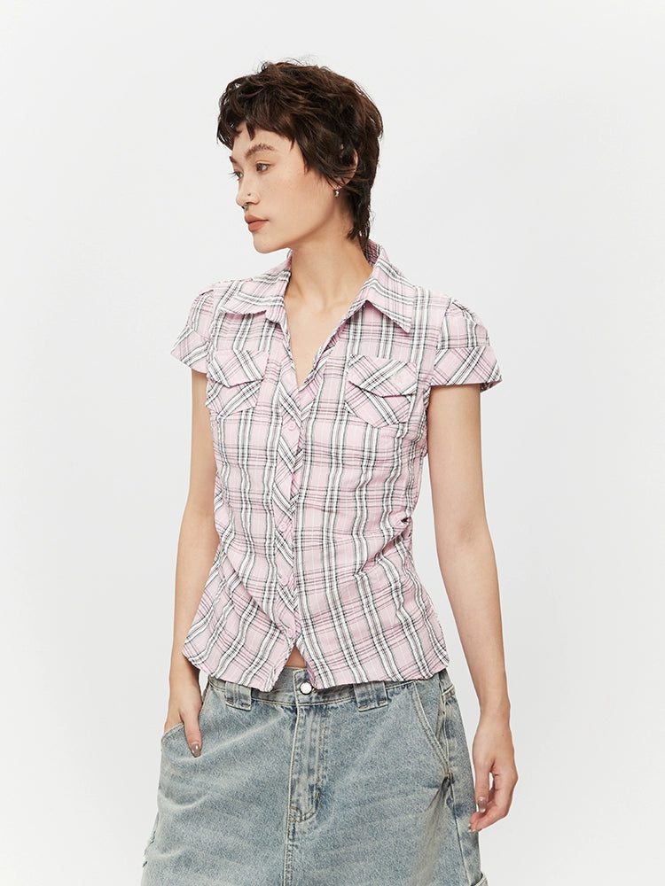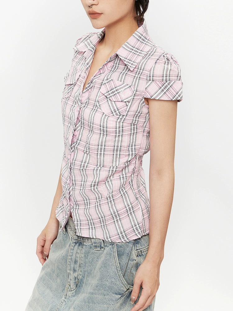 Camisa de Botão Ajustada de Manga Curta Xadrez