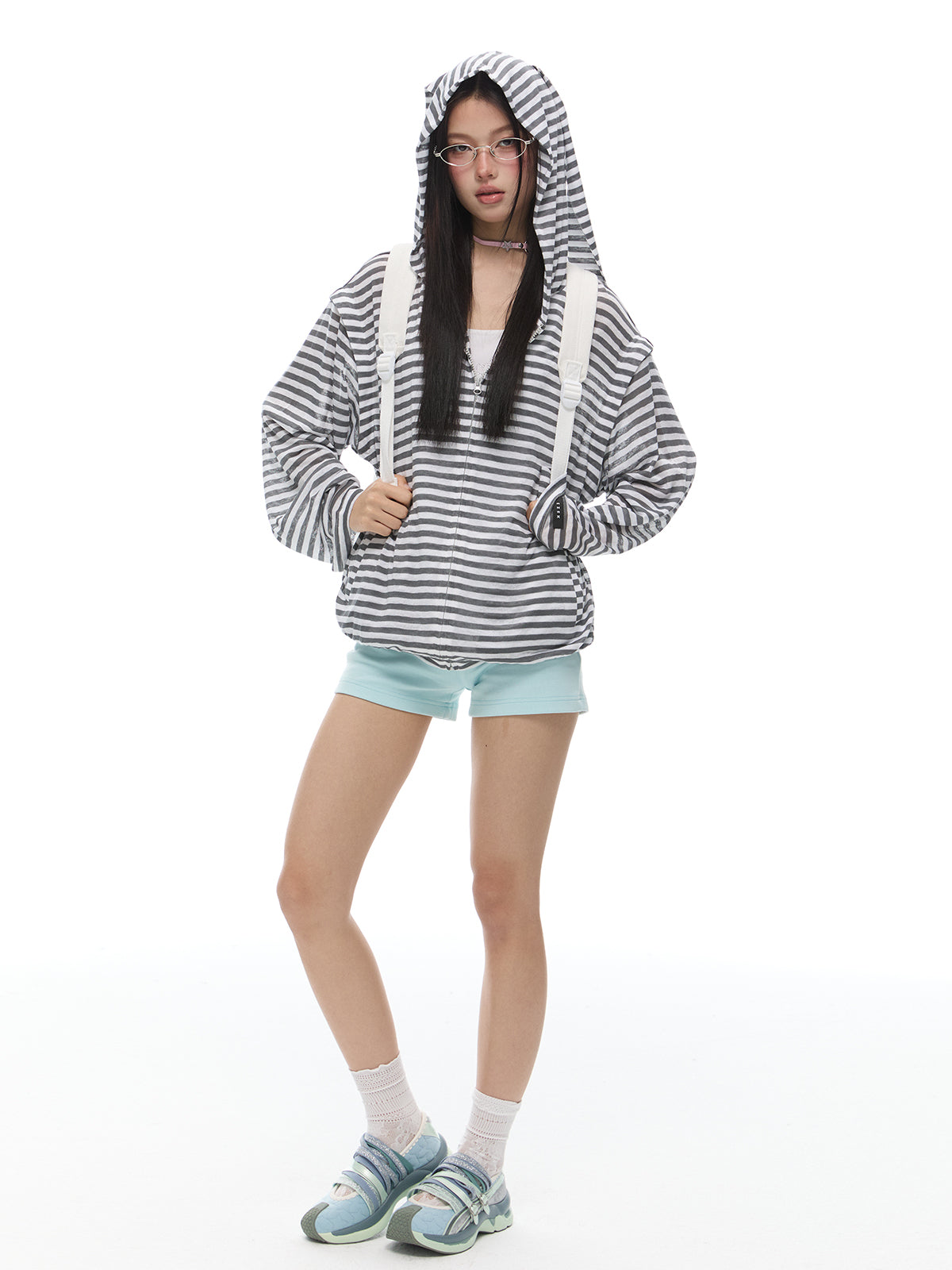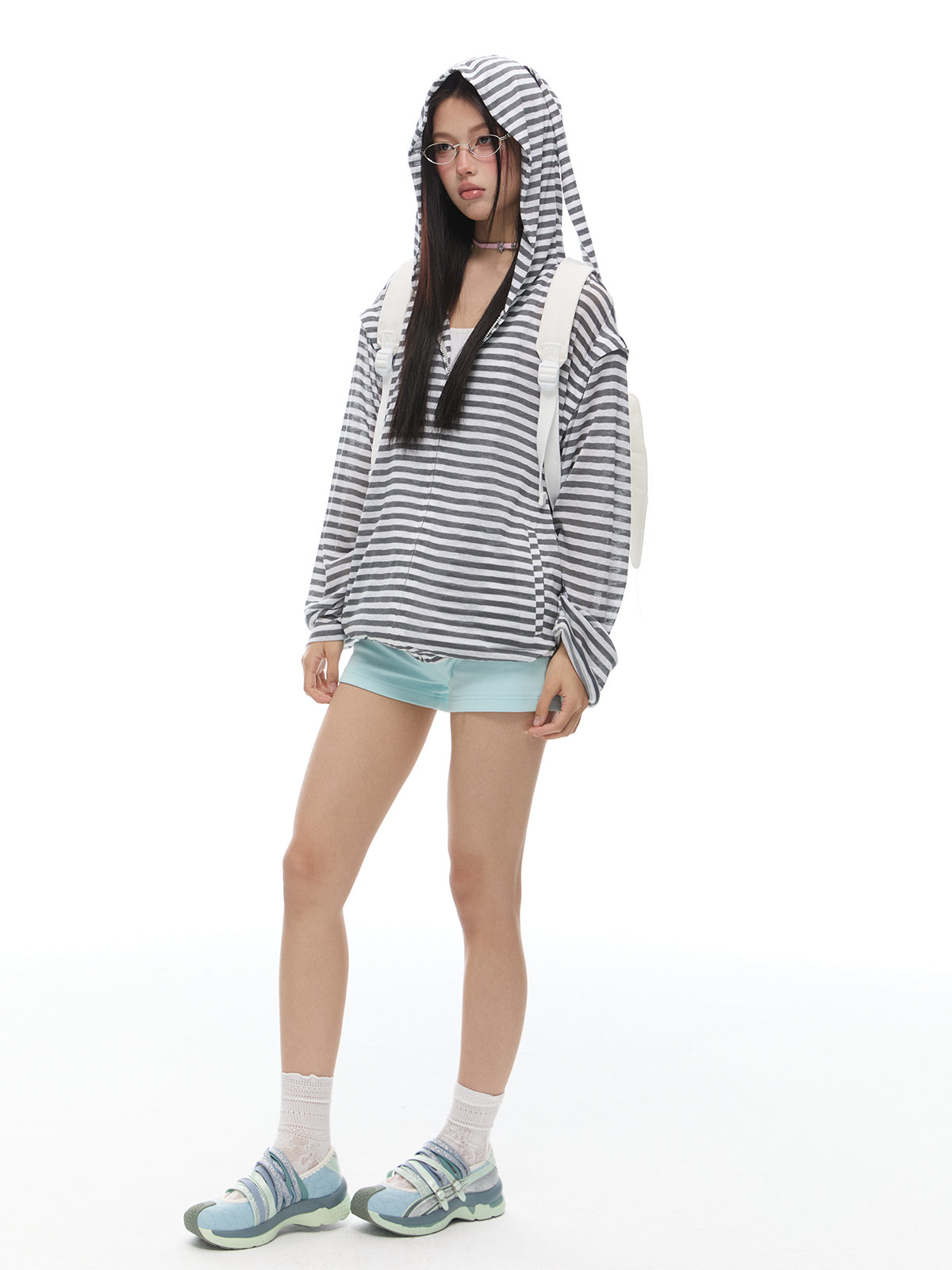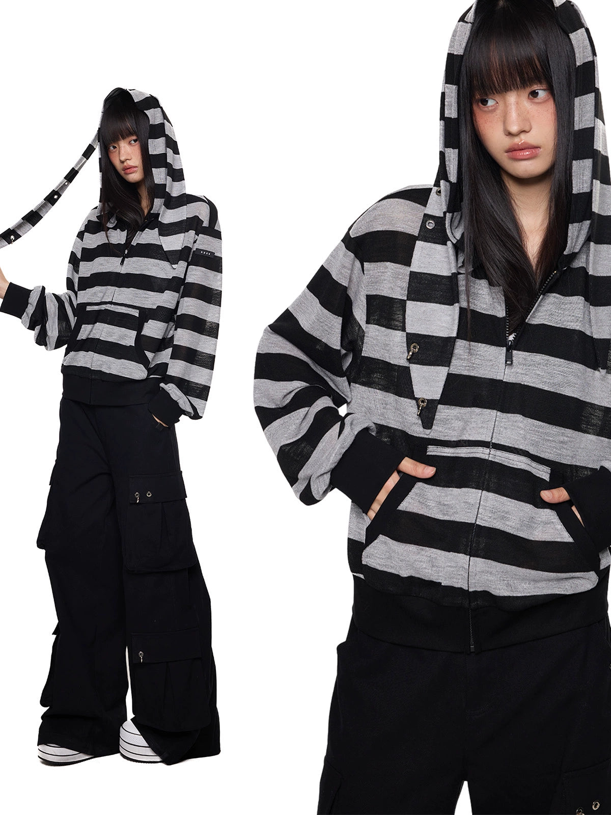 Top de Proteção Solar com Capuz e Orelhas de Coelho Listradas