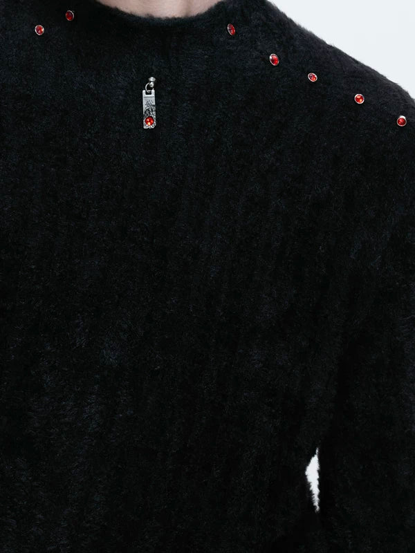 - Украшения из красных драгоценных камней создают визуальный контраст с спокойной текстурой черной ткани и добавляют деликатные акценты.