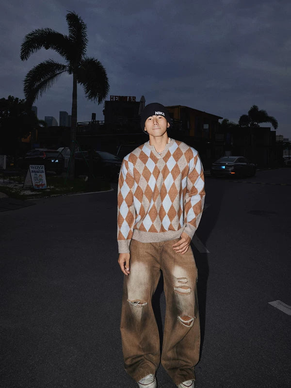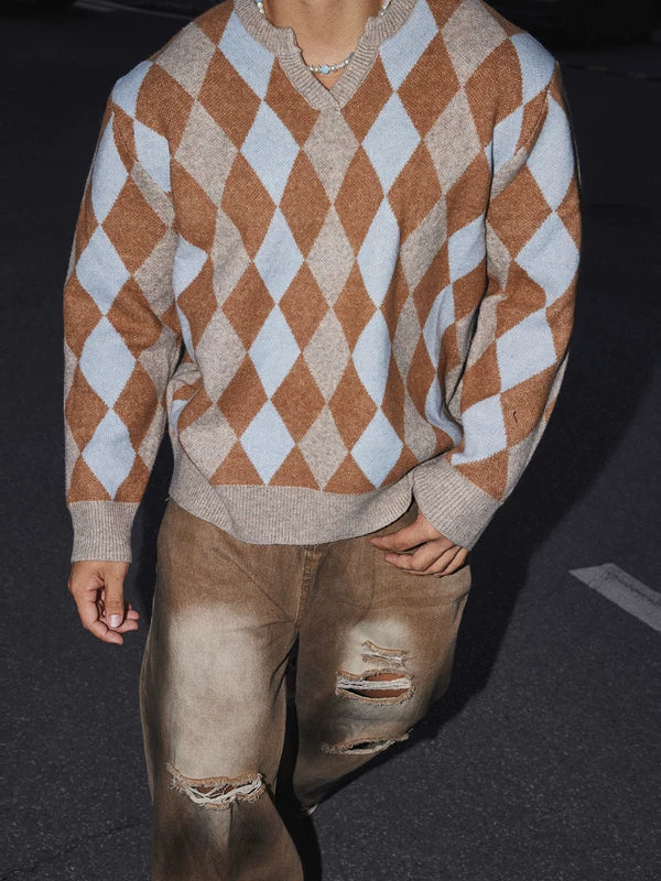 Свитер с расслабленным кроем и V-образным вырезом в ромбовидный узор
