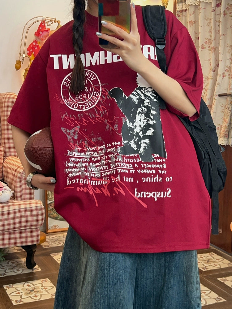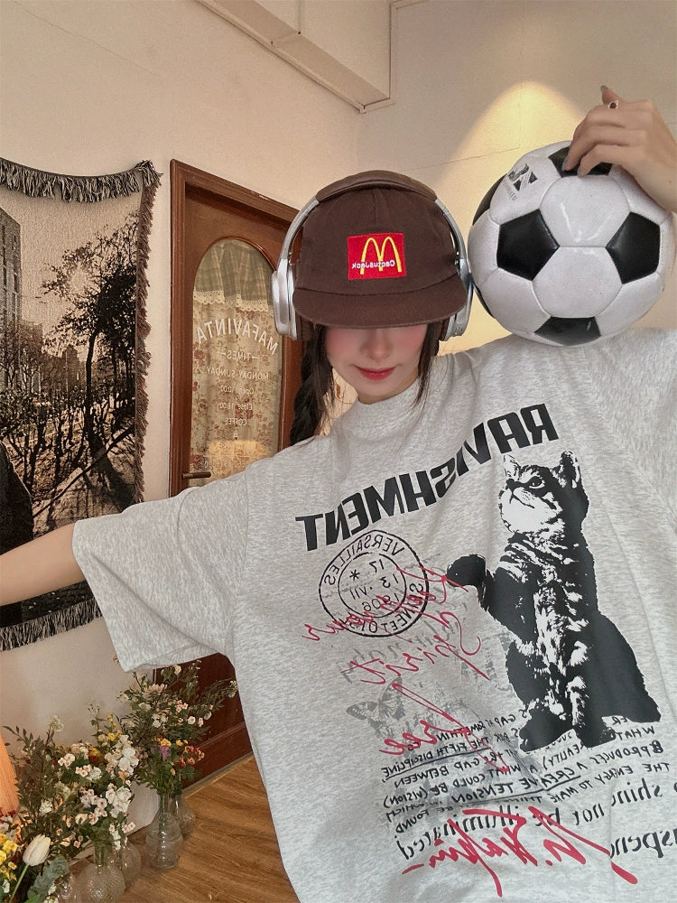 Cat Print Loose Fit Short Sleeve T-Shirt