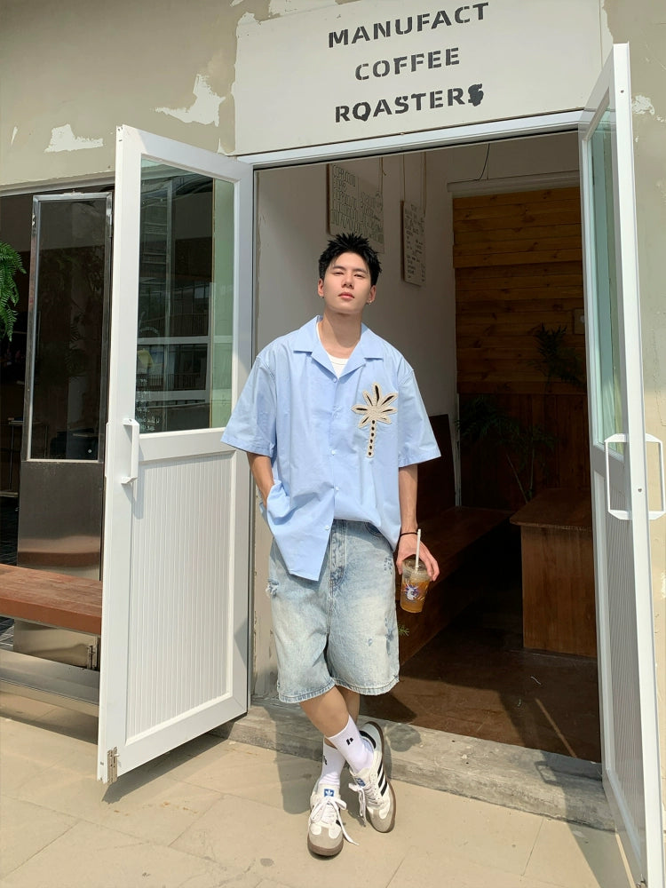 Cuban Collar Embroidered Flower Short Sleeve Shirt