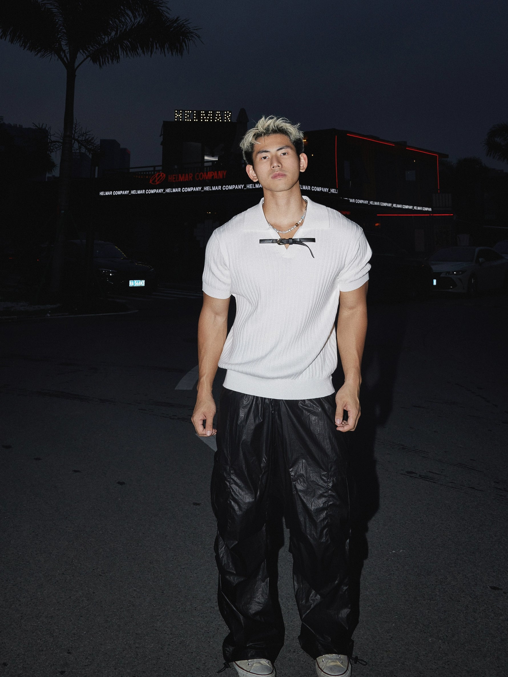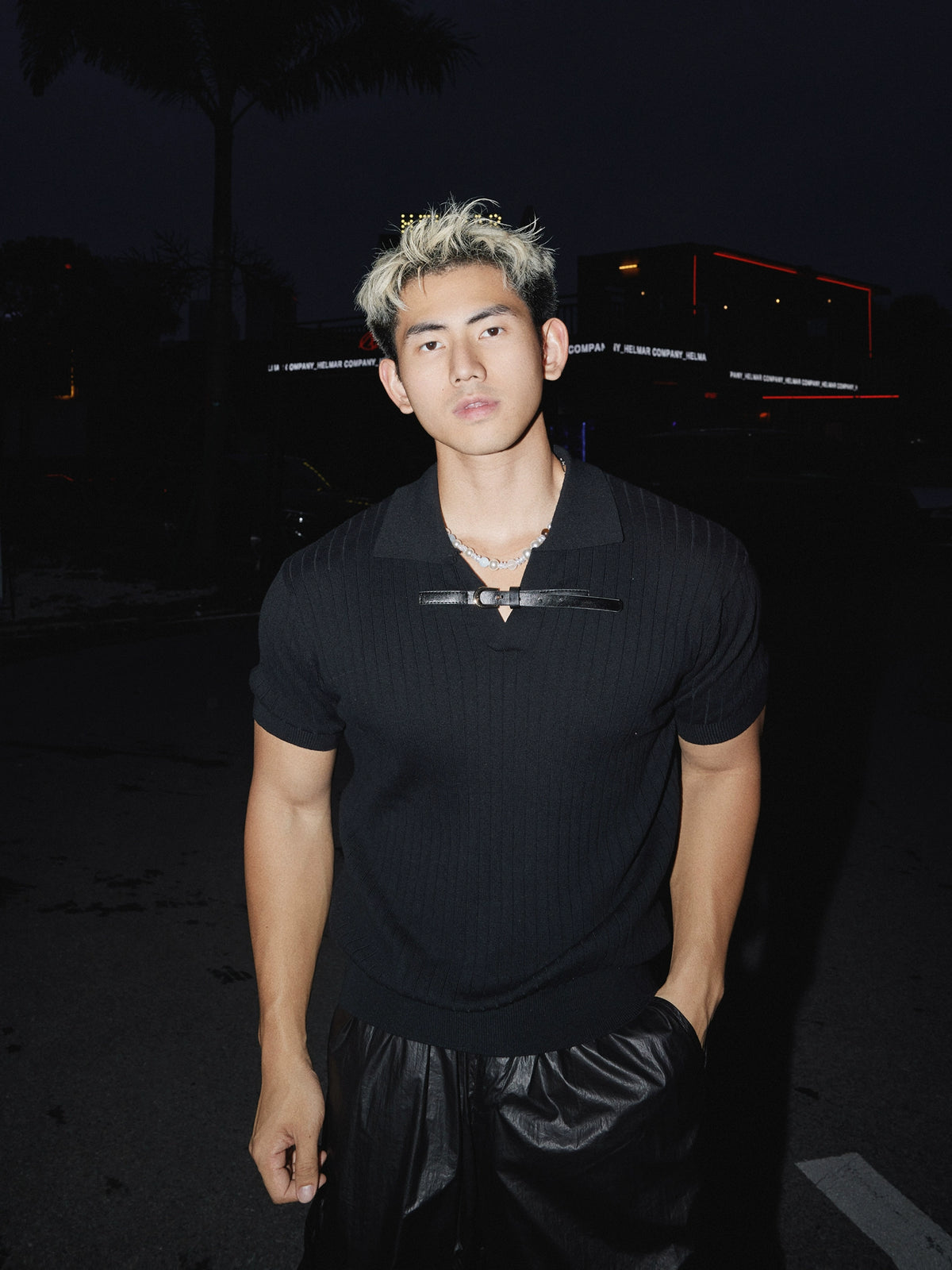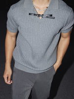Leather Buckle Ribbed Knit Short Sleeve Shirt