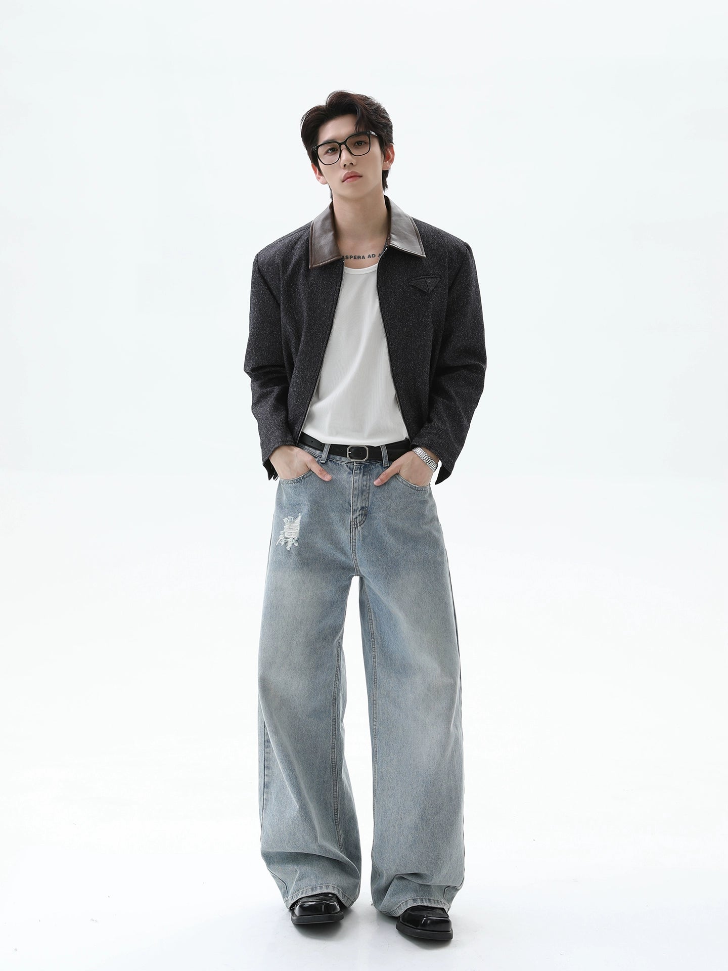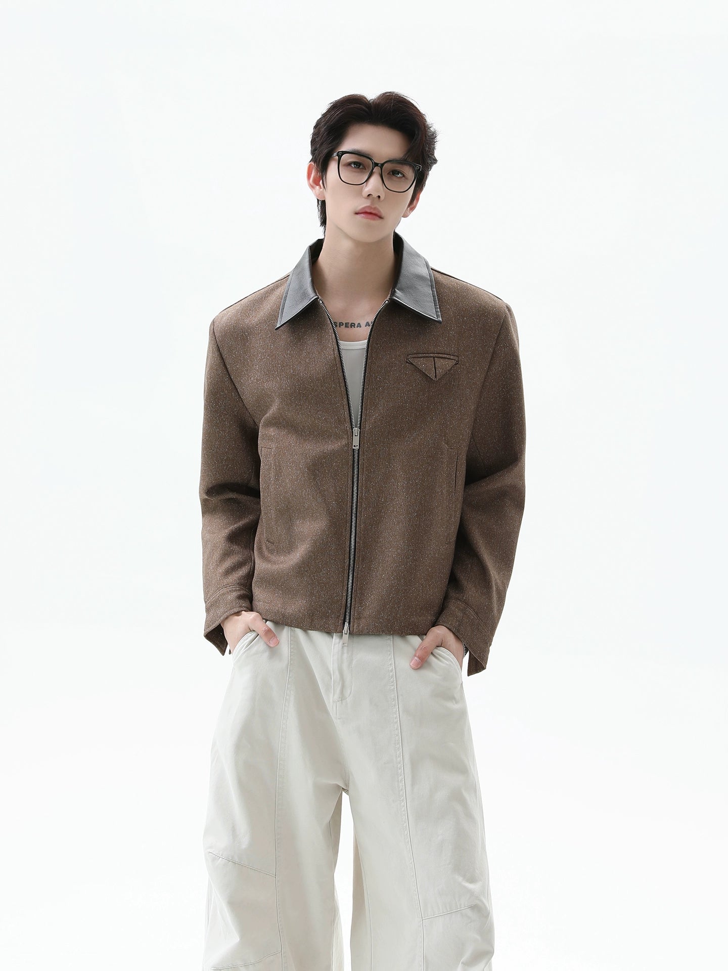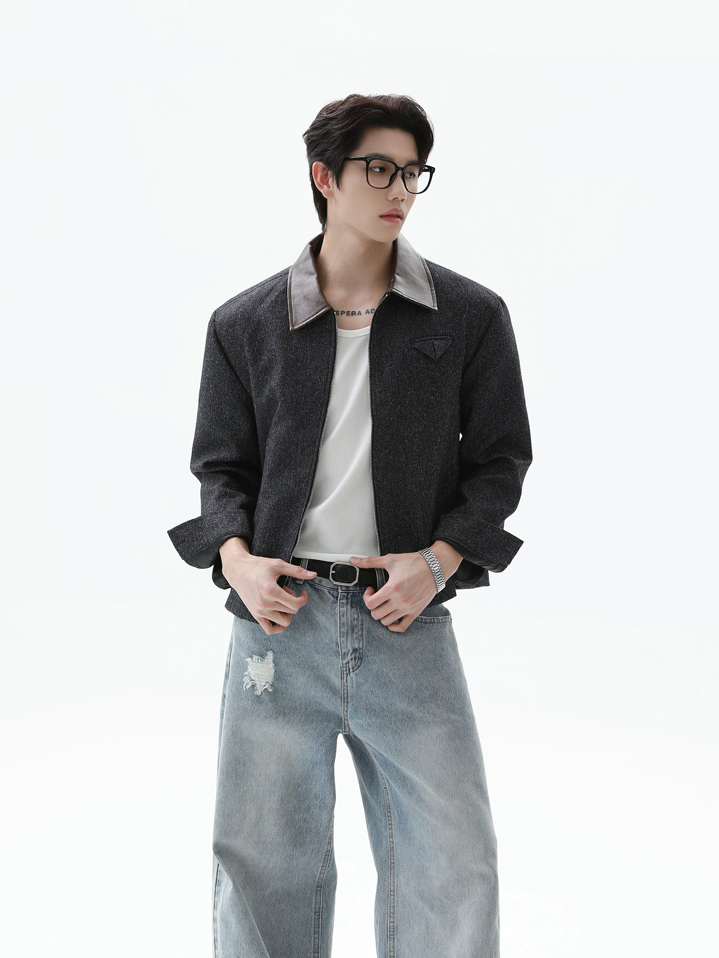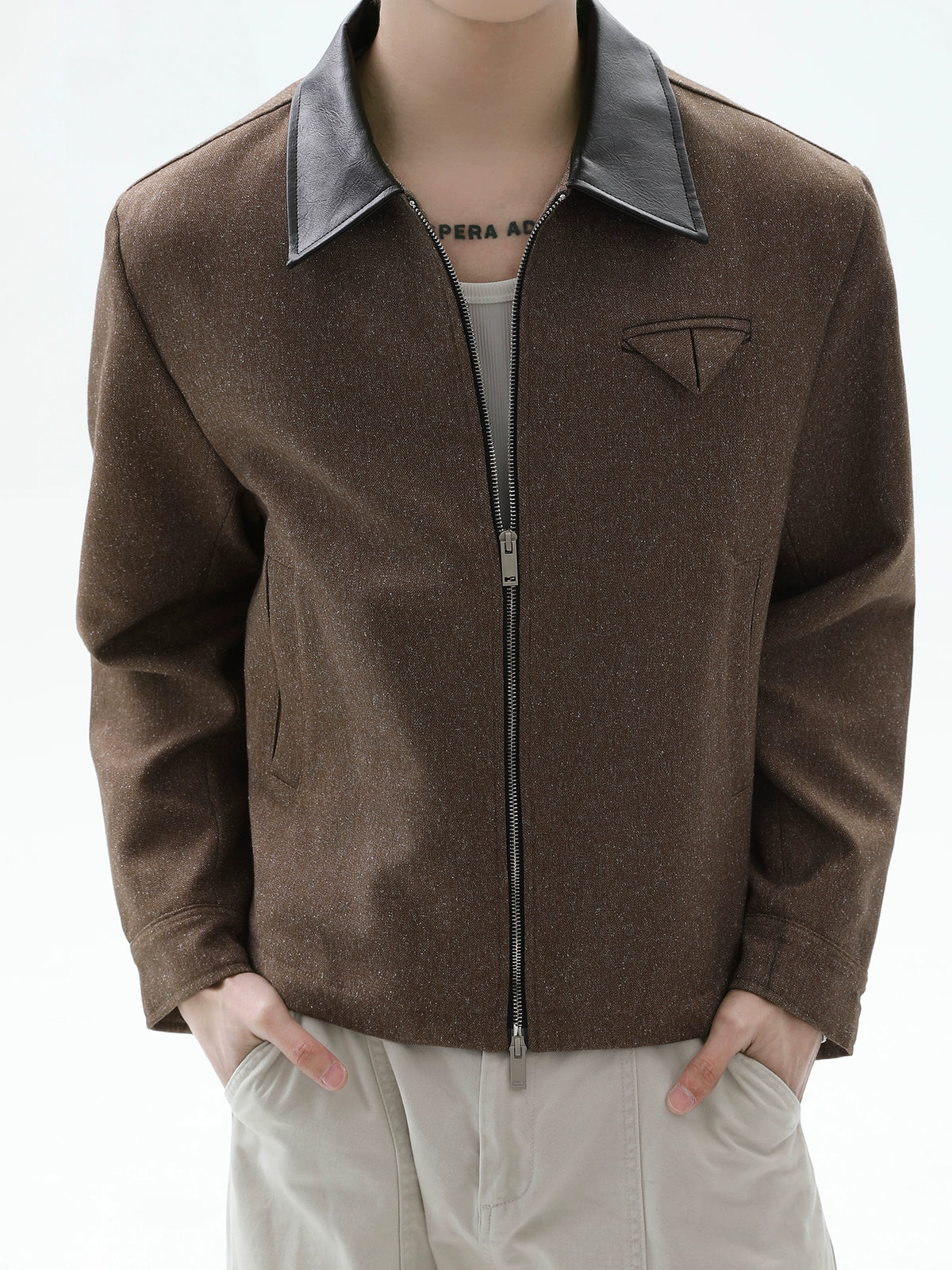 Leather Splicing Lapel Zipper Jacket