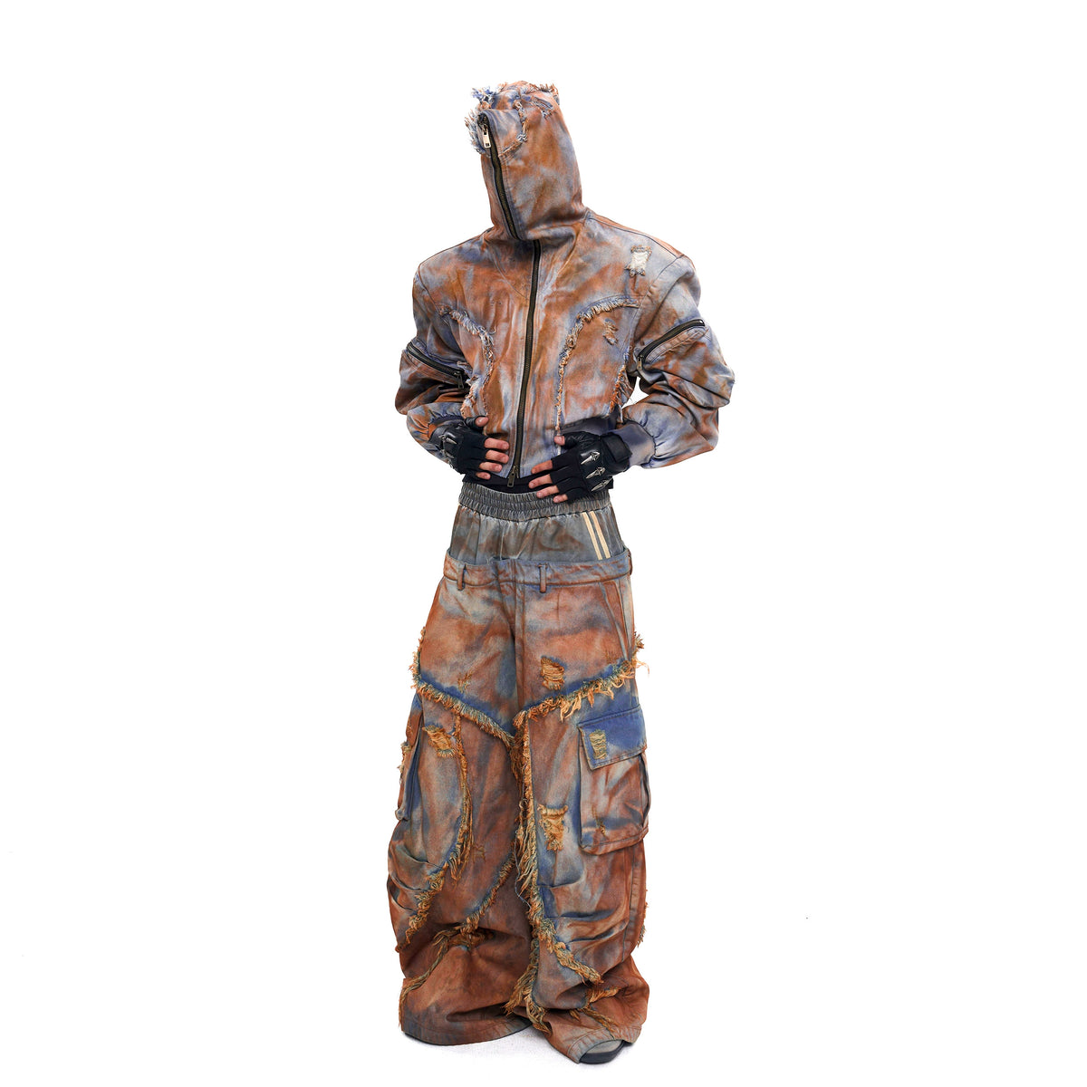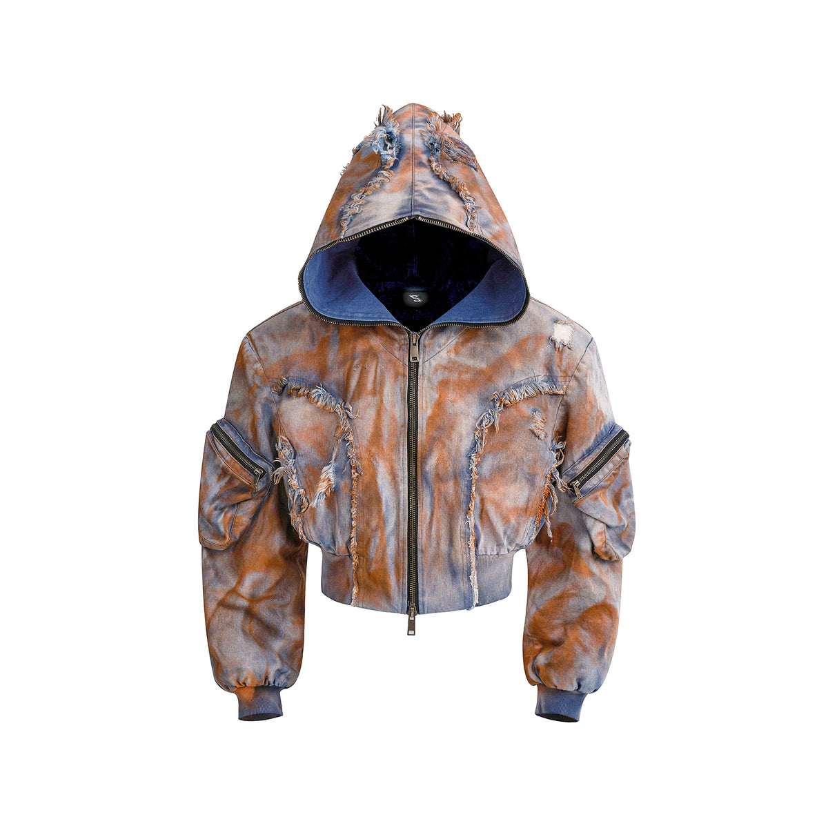 - Irregular structure with distressed wool edge, short cropped hooded jacket with mud dyeing, multi-deconstructed irregular fabric design.
