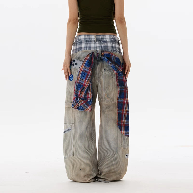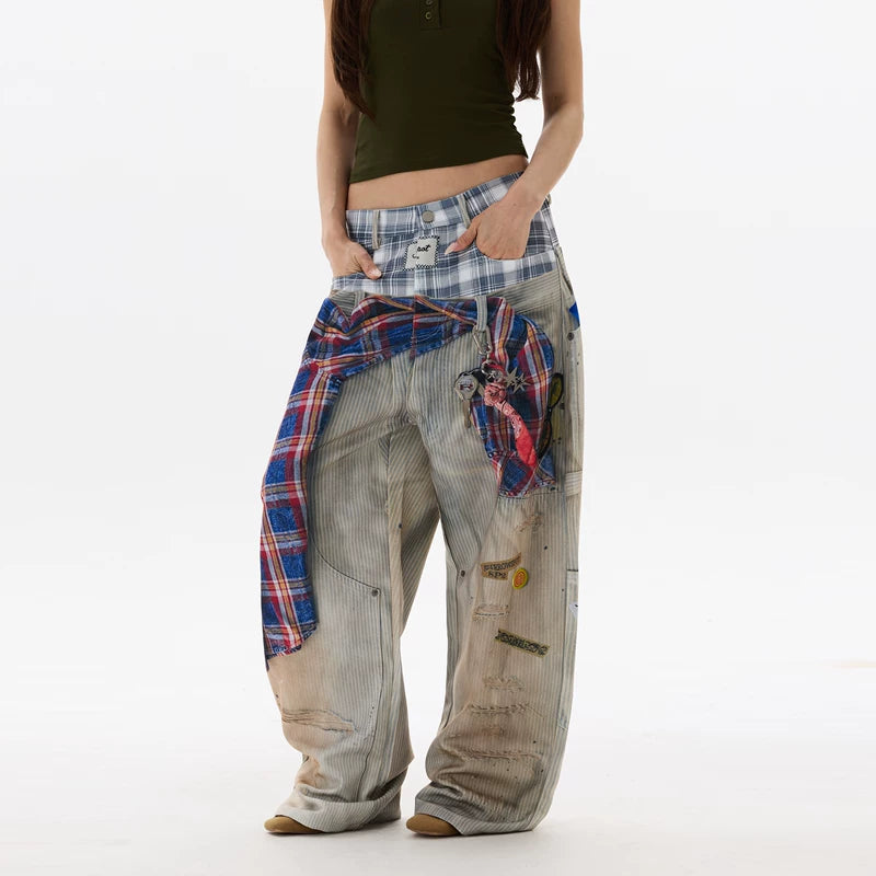 3D Baskılı Bol Yamalı Kot Pantolon