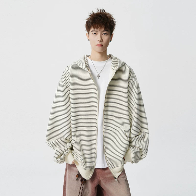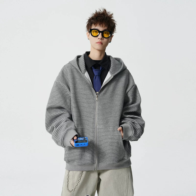 Büyük Beden Çizgili Fermuarlı Kapüşonlu Sweatshirt