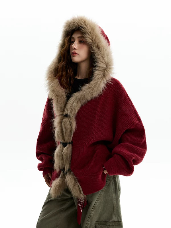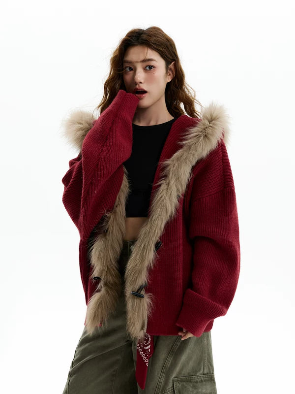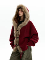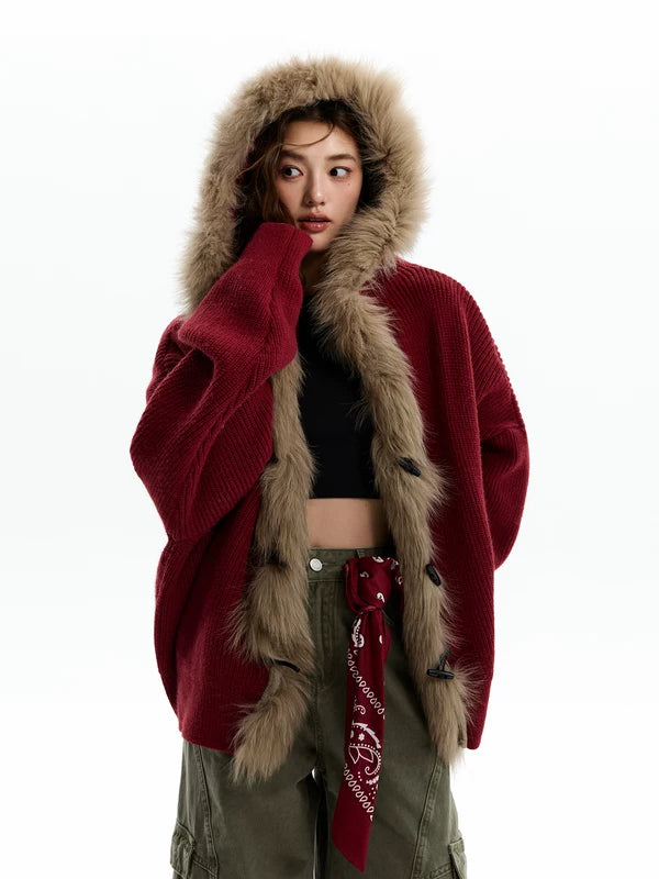 Sahte Kürk Kenar Detaylı Kapüşonlu Örgü Hırka