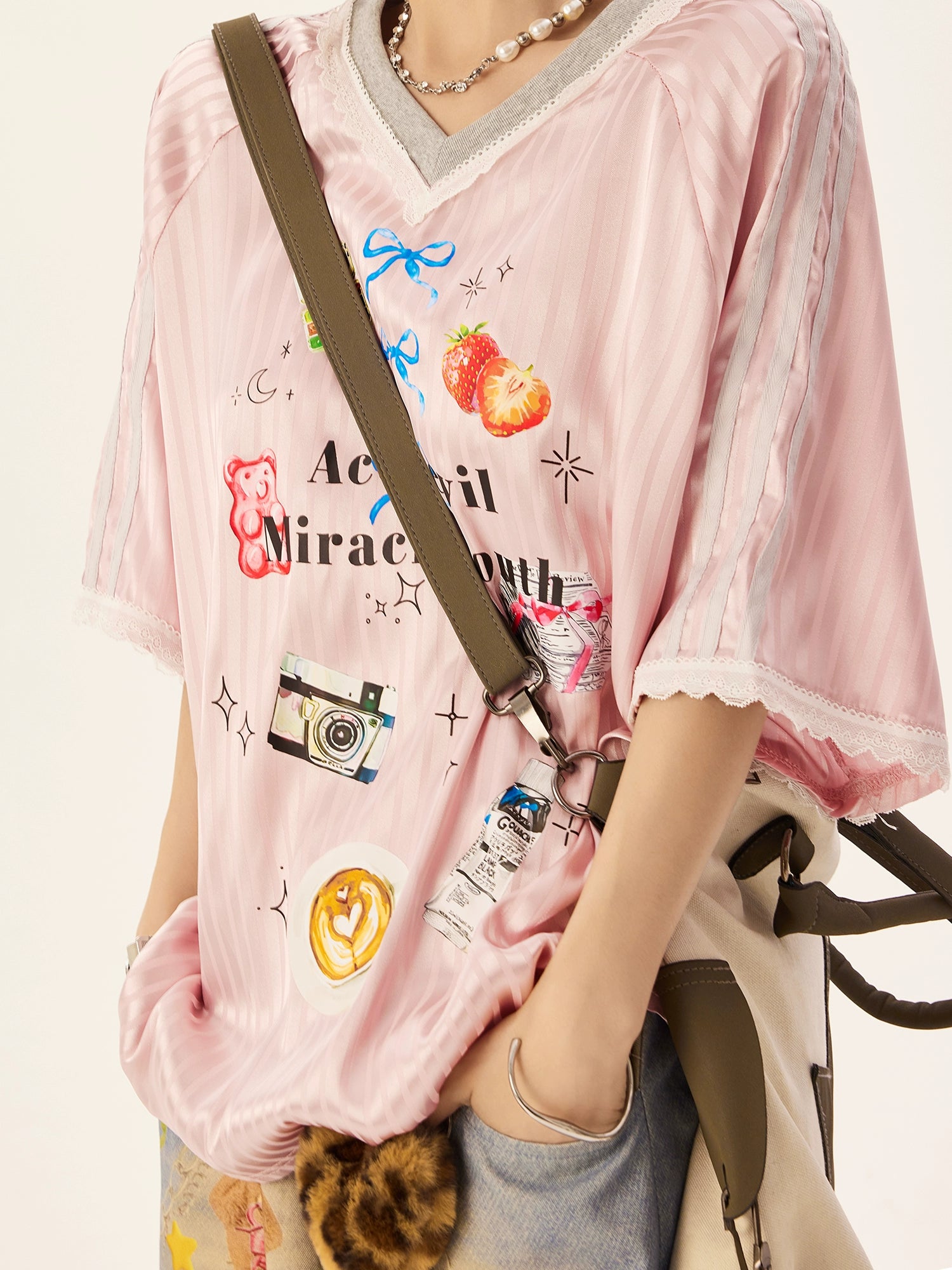 Retro Çizgi Film Grafik V-Yaka Jersey Üst
