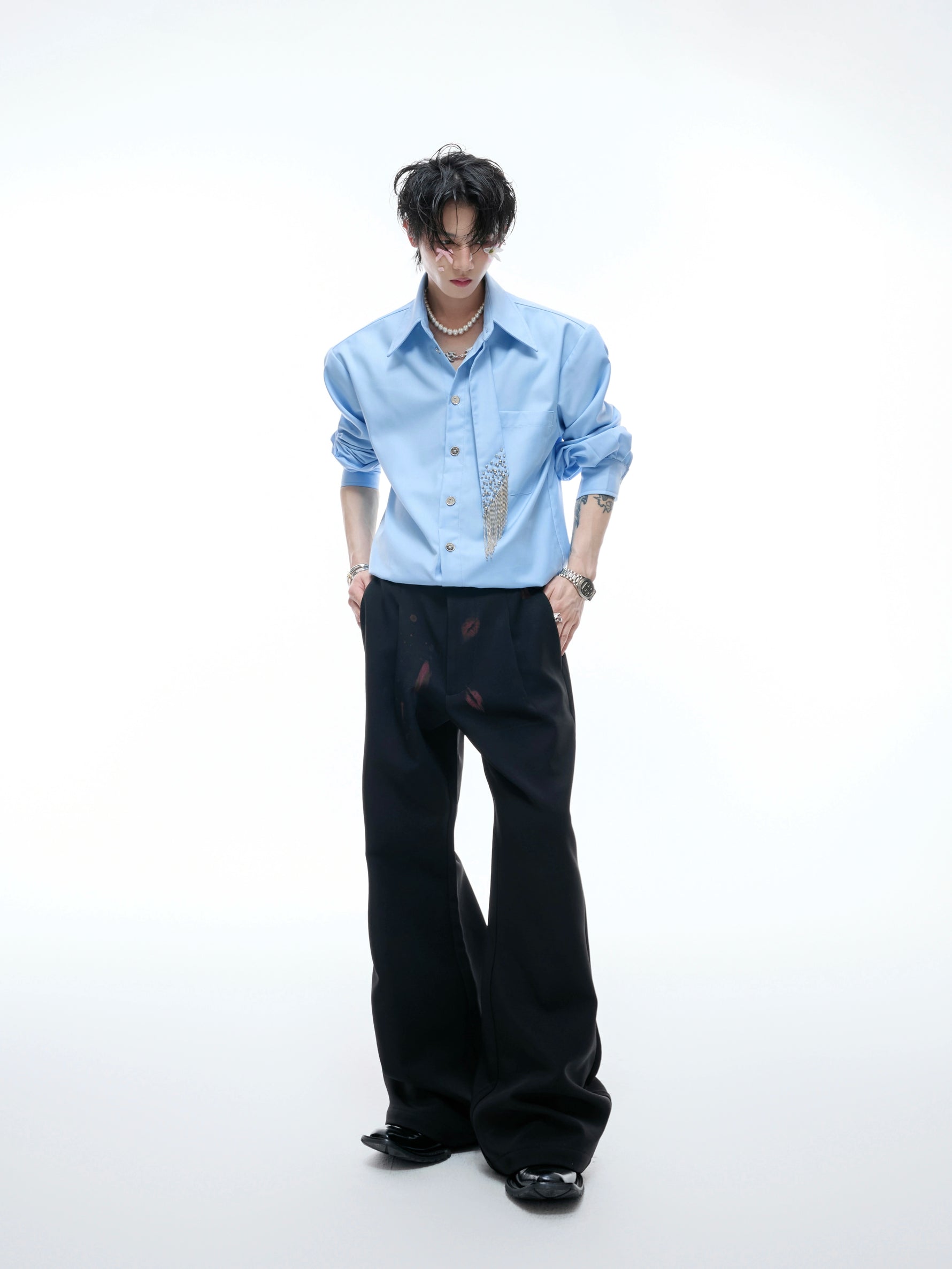 - Bağlama kısmı, minimalist bir görsel etkiyi koruyarak kabarcık boncukları ve elde dikilmiş zincirler kullanır.