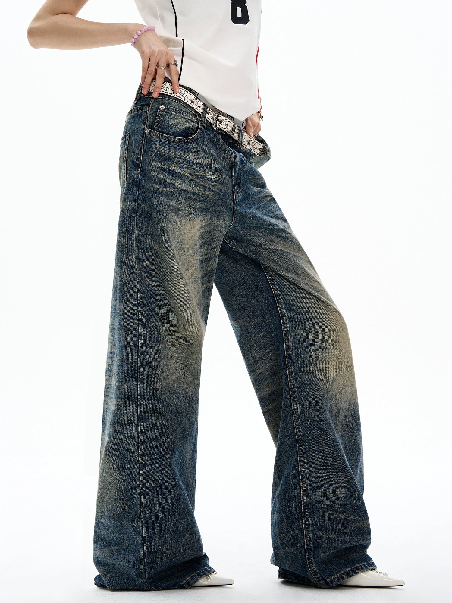 Retro Yıpranmış Geniş Paça Kot Pantolon